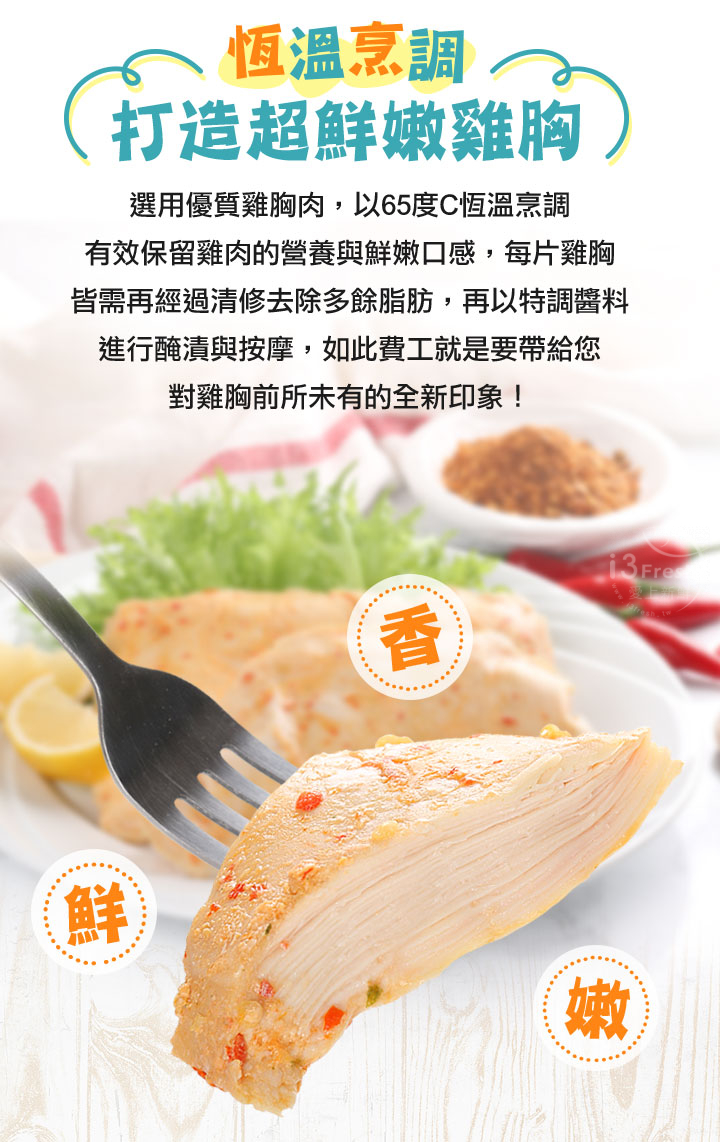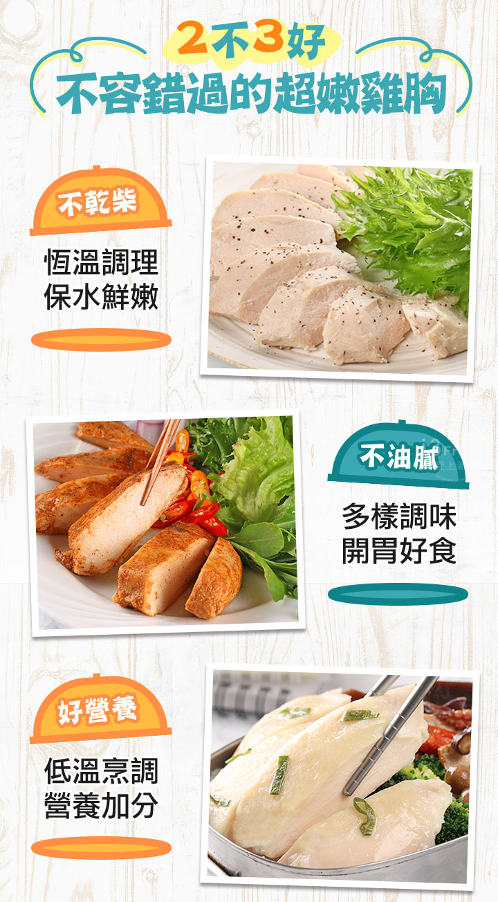 選用優質雞胸肉,以65度C恆溫烹調,有效保留雞肉的營養與鮮嫩口感,再以特調醃料進行醃漬與按摩,就是要帶給您對雞胸前所未有的全新印象!