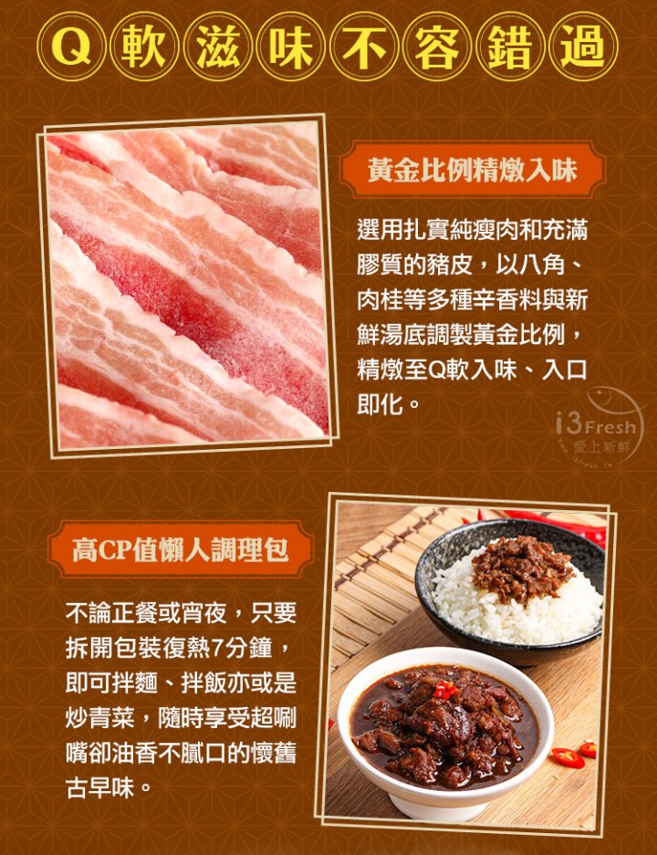 產品成份:豬肉、水、豬皮、醬油、蔥酥(蔥頭、棕櫚油)、冰糖、鹽、八角、肉桂、小茴香、花椒、陳皮、肉豆蔻