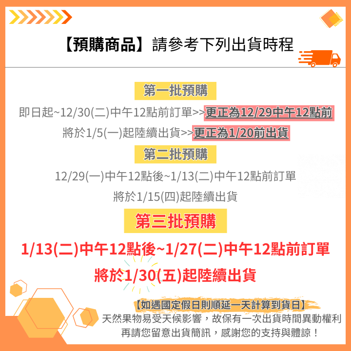 3. 訂單款項須於販售時間內完成付款,若未完成付款之訂單,將安排於下次出貨,造成不便敬請原諒。