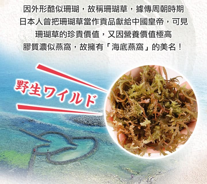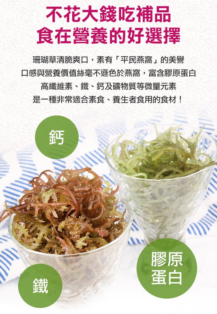 珊瑚草是一種高營養、高價值的貴重食物。其營養價值極高。珊瑚草長時間吸收純淨澎湖海域的精華,富含豐富膠質,又被稱為「海底燕窩」。