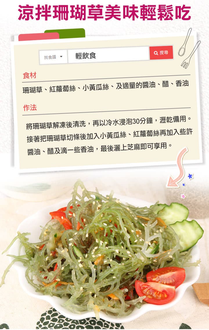 食用方式:解凍拆封後用冷飲用水清洗後,浸泡冷飲用水30分鐘後,即可涼拌或煮湯