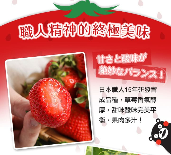 來自熊本縣鮮採空運,日本職人15年研發育成獨家品種,紅豔色澤與飽滿果實,草莓香氣醇厚果肉多汁,甜味酸味完美平衡,是冬季裡季節限定的甜蜜美味!