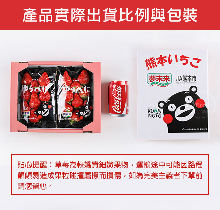1.草莓為較嬌貴果物,運輸途中可能因路程顛頗易造成果粒碰撞受傷,如為完美主義者下單前請您留心。