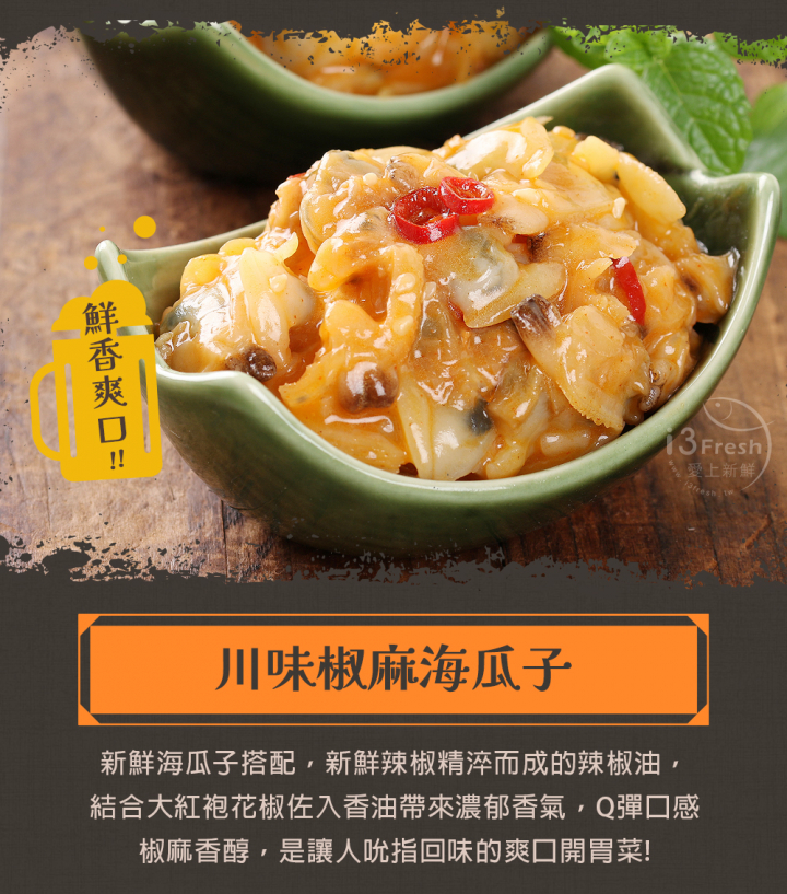 商品成分:海瓜子、花椒油【大豆油、大紅袍花椒、抗氧化劑(混合濃縮生育醇)】、液糖【糖(果糖、葡萄糖)、水】、辣椒油(大豆油、花椒油、辣椒萃取物)、鹽、糖、香油(芝麻油、大豆油)、味醂(果糖、水、糯米、米麴、鹽)、芝麻、L-麩酸鈉、辣椒粉、辣椒、玉米糖膠、5’-次黃嘌呤核苷磷酸二鈉、5’-鳥嘌呤核苷磷酸二鈉。