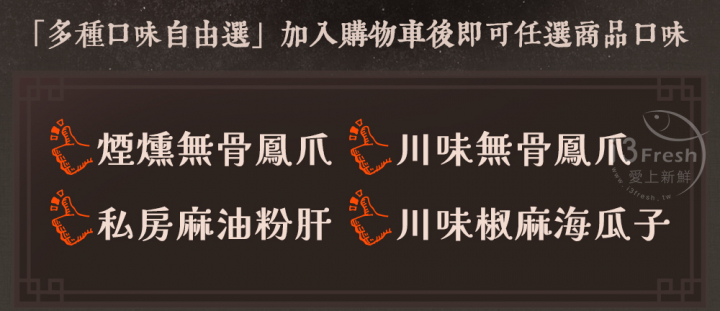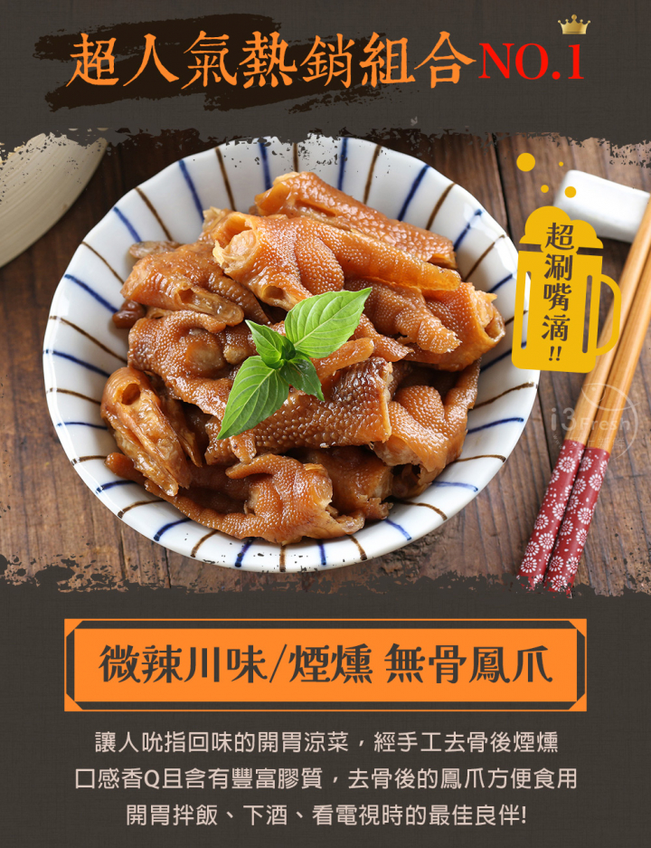 產品成分:雞爪、香油、蠔油、二砂、L-麩酸鈉、酵母抽出物、大豆水解蛋白液、麥芽糊精、鹽、焦糖、琥珀酸二鈉、5’-鳥嘌呤核苷磷酸二鈉、5’-次黃嘌呤核苷磷酸二鈉、L-丙胺酸、洋蔥粉、豬肉抽出物、釀造醬油(非基因改造黃豆)、乳化劑(脂肪酸甘油酯)、營養強化劑(鹽酸硫胺明、維生素B1)、抗氧化劑(混合濃縮生育醇VITE)、蒜粉、玉米澱粉分解物、精製軟棕油、大豆油、芥花油、香料(L-半胱胺酸鹽酸鹽)、二氧化矽、甘草酸銨(甜味劑)、胺基乙酸、檸檬酸鈉、DL-胺基丙酸、白胡椒粉、麻辣醬(沙拉油、蔥、蒜、辣椒、豆瓣、花椒、白胡椒、黑胡椒、八角、雞心椒、肉桂、草果)