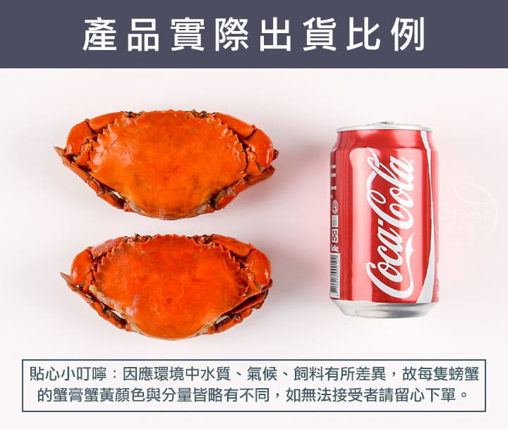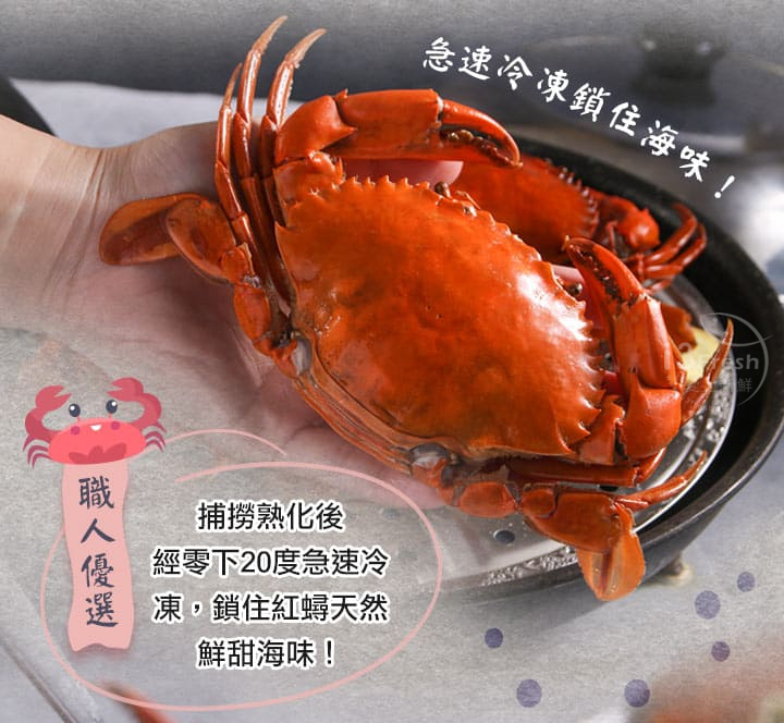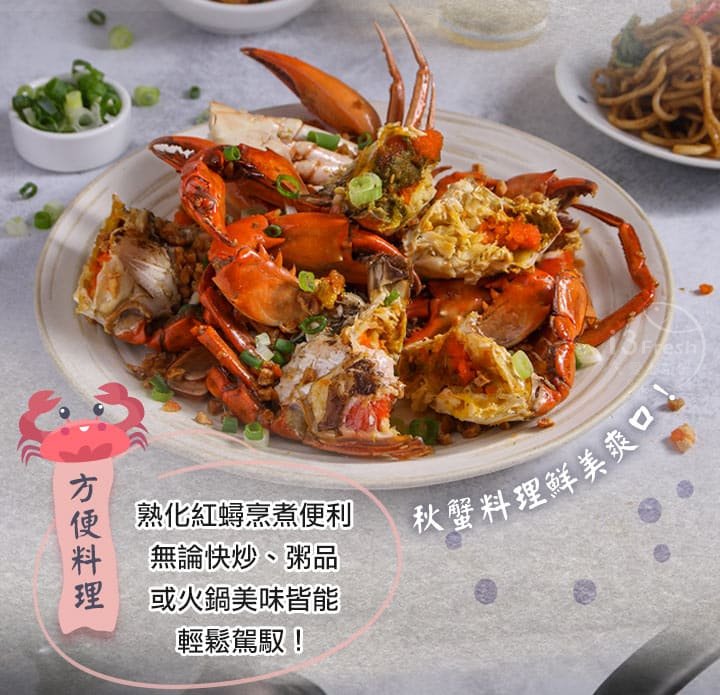 食慾之秋亦是螃蟹正肥美的季節,選用各個蟹黃飽滿的紅蟳,清蒸後急速冷凍保留鮮甜緊緻的肉質。紅蟳的蟹卵呈現飽和橘黃色,口感Q彈、味道濃郁,正是季節限定的美味!