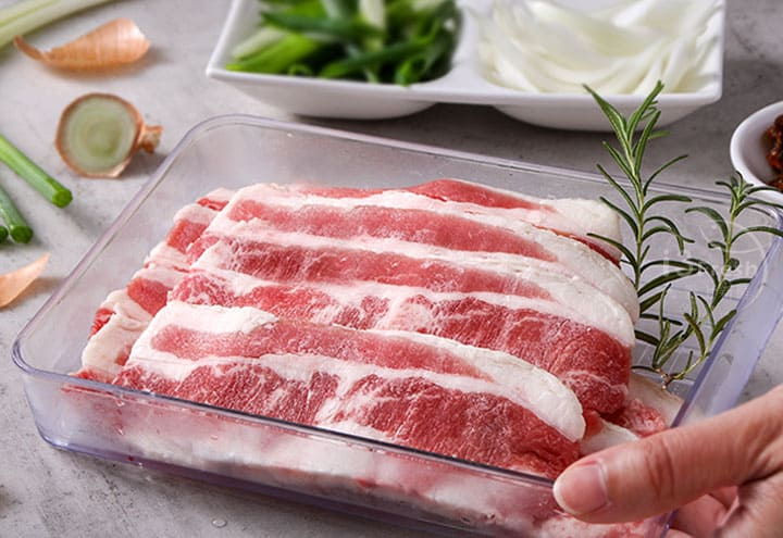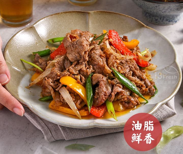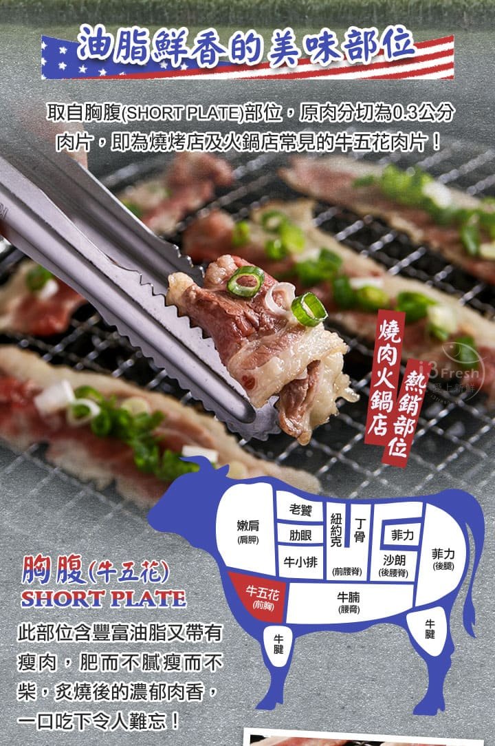 選用Choice等級胸腹肉,也通稱牛五花,油花豐厚、肉質結實,口感軟嫩適中,0.3公分的厚切規格,不論火鍋、燒烤都適合。