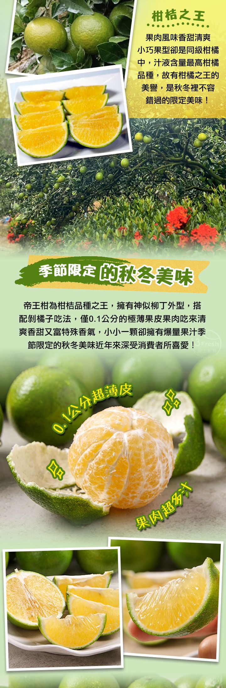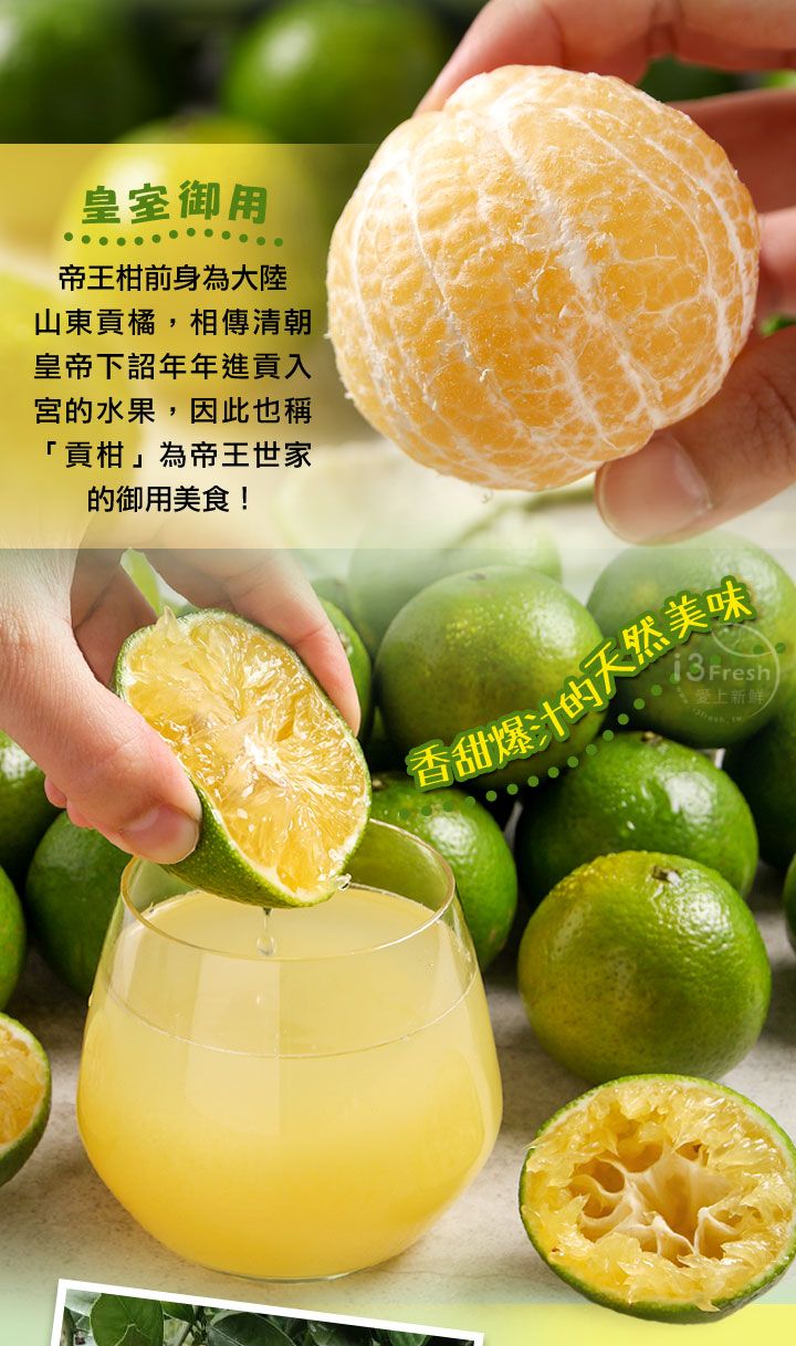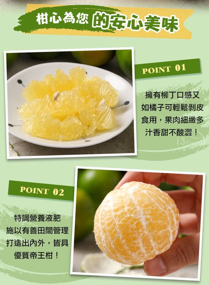 帝王柑擁有柳丁口感又如橘子可輕鬆剝皮食用,特調營養液肥施以有善田間管理,0.1公分極薄果皮,爆汁果肉細緻清甜不酸澀!