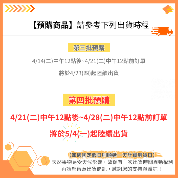 保存方式:建議收到時務必開箱通風並放常溫,待變軟後再食用會更加香甜多汁,若未即時食用,請務必置於冰箱,建議一周內食用完畢,為最佳賞味期