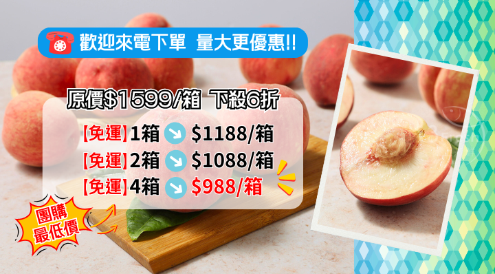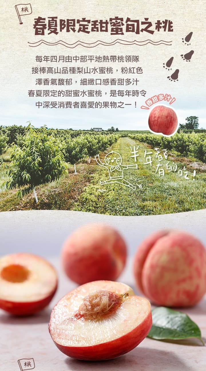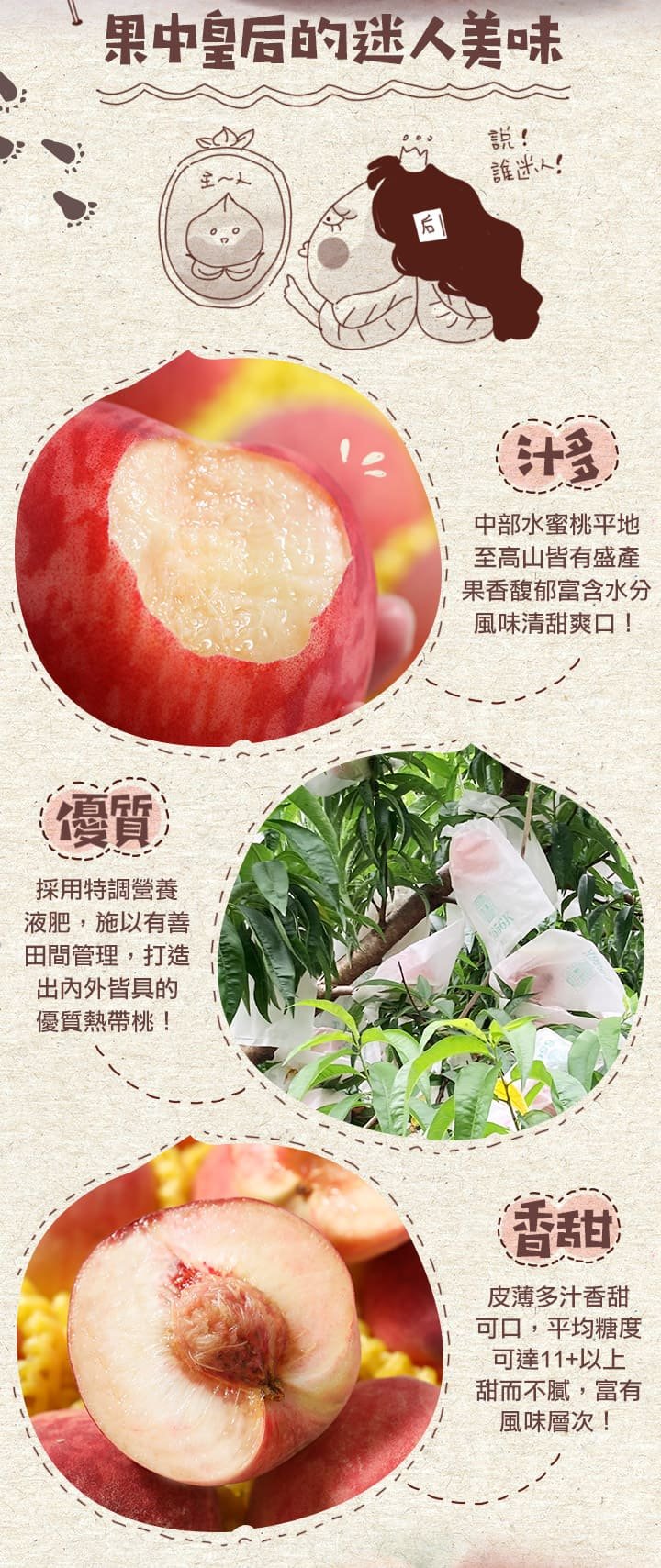台灣育成熱帶平地水蜜桃,果香馥郁果肉富含水份,皮薄多汁香甜可口,富有風味層次!