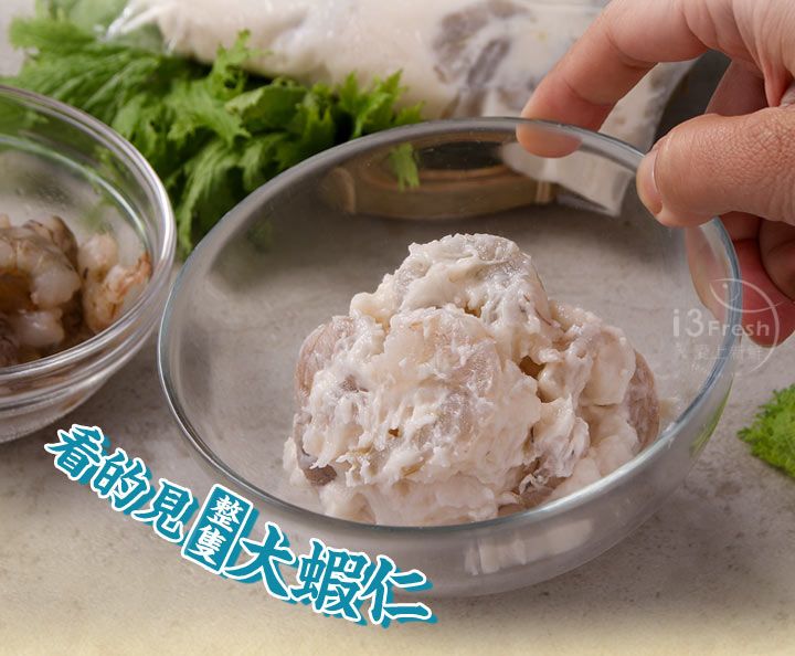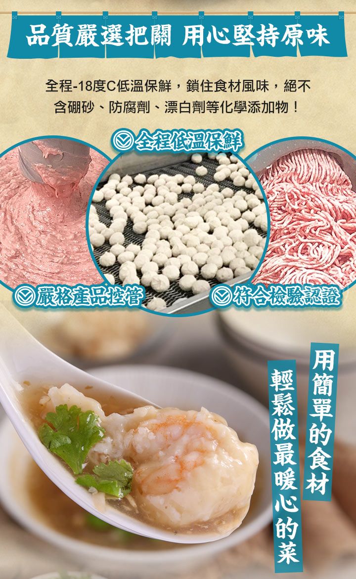 商品成分:冷凍魚漿(金線魚肉、糖、蛋白、多磷酸鈉、焦磷酸鈉)、草蝦仁、冷凍豬脂(台灣)、蒜頭、特砂、精鹽、芝麻油、蛋白粉、小麥蛋白粉、馬鈴薯澱粉、味素(L-麩酸鈉)、葡萄糖、乙基麥芽醇、品質改良劑(多磷酸鈉、焦磷酸鈉(無水)、偏磷酸鉀)、調味劑(DL-胺基丙酸、琥珀酸二鈉、檸檬酸鈉、胺基乙酸、5'-次黃嘌呤核苷磷酸二鈉、5'-鳥嘌呤核苷磷酸二鈉)
