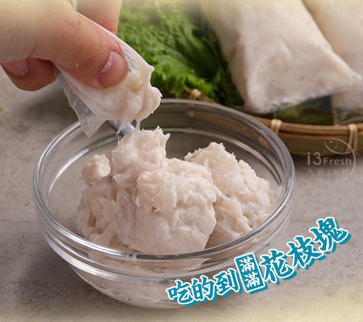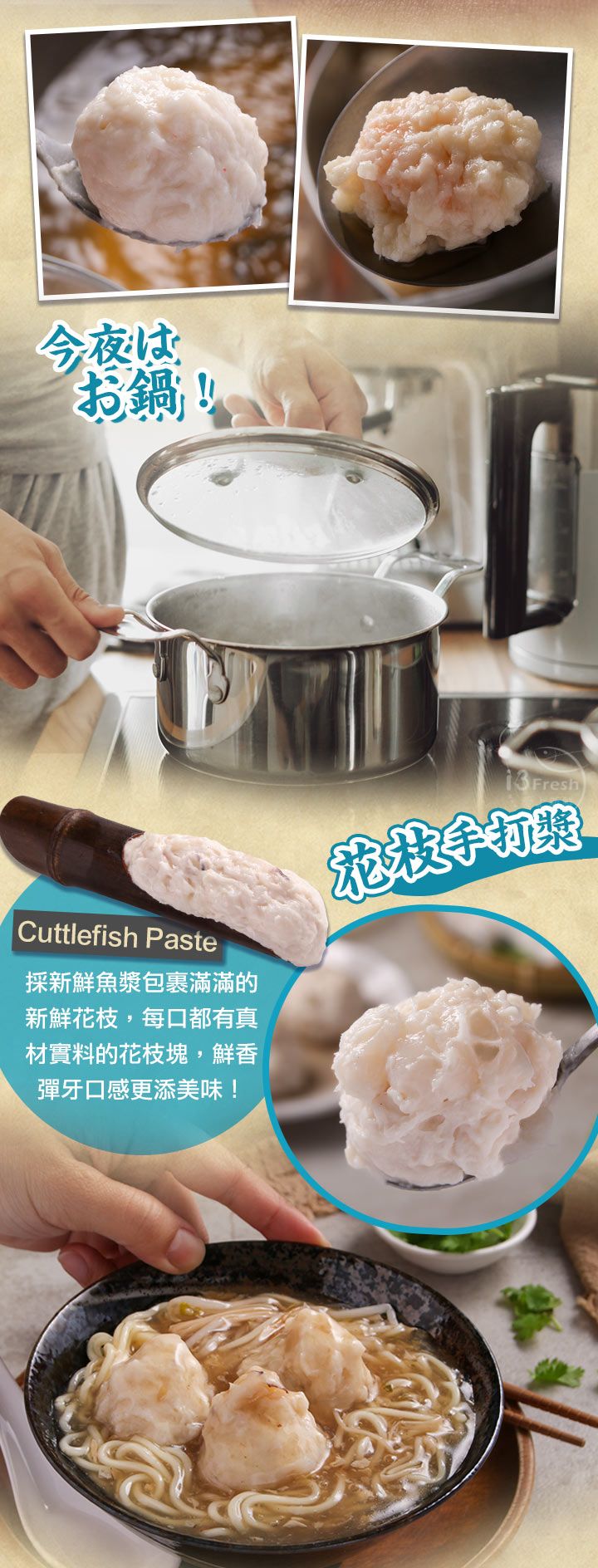 花枝漿,吃得到滿滿墨魚顆粒,蝦仁漿質地Q彈,吃的到一整隻蝦仁,鮮香滋味讓人回味無窮,用法很多加入火鍋即可在家享受到高級火鍋!