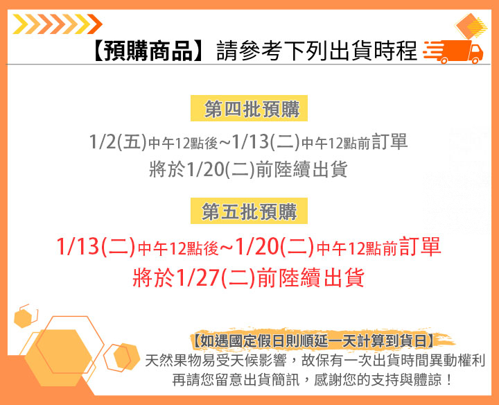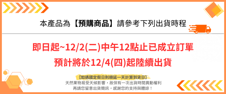 保存方式:到貨後於通風常溫下放置1~2天後熟的風味更佳。