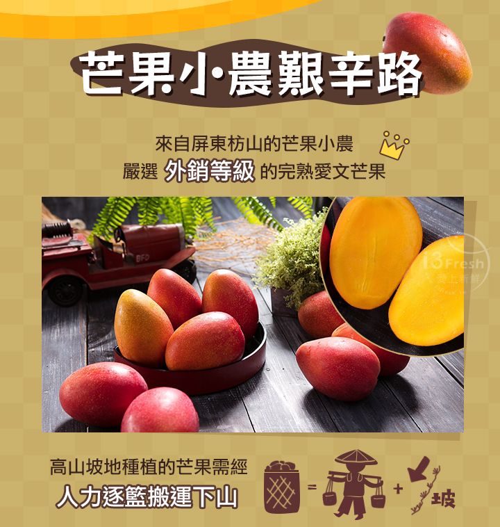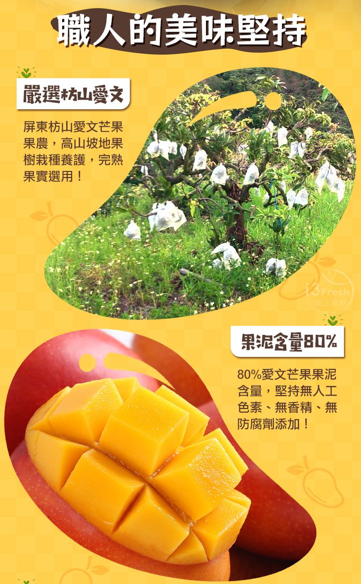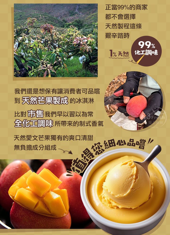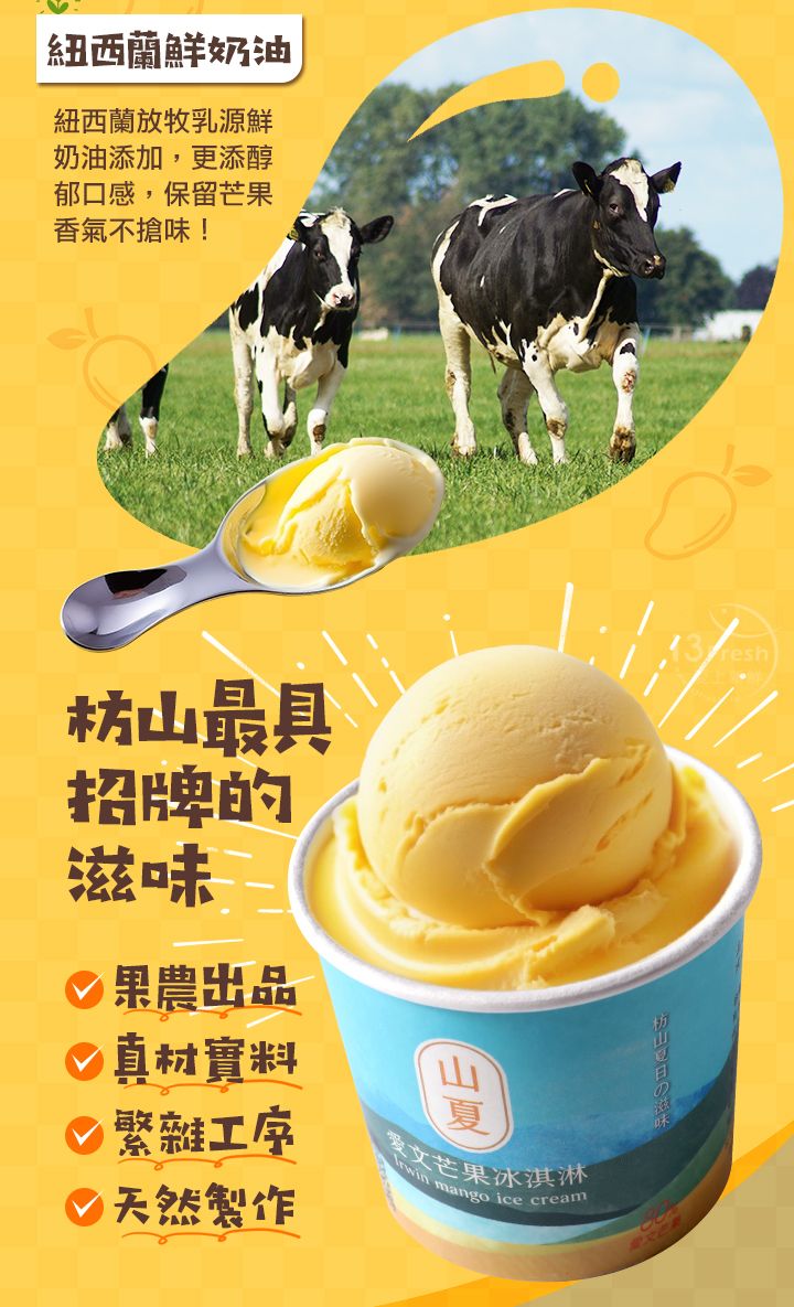 屏東枋山愛文芒果果農出品,山坡地種質肉果Q彈香氣濃郁,完熟果實選用,堅持無色素、無香精、無防腐劑!添加紐西蘭放牧乳源鮮奶油,更添醇郁口感,保留芒果香氣不搶味!