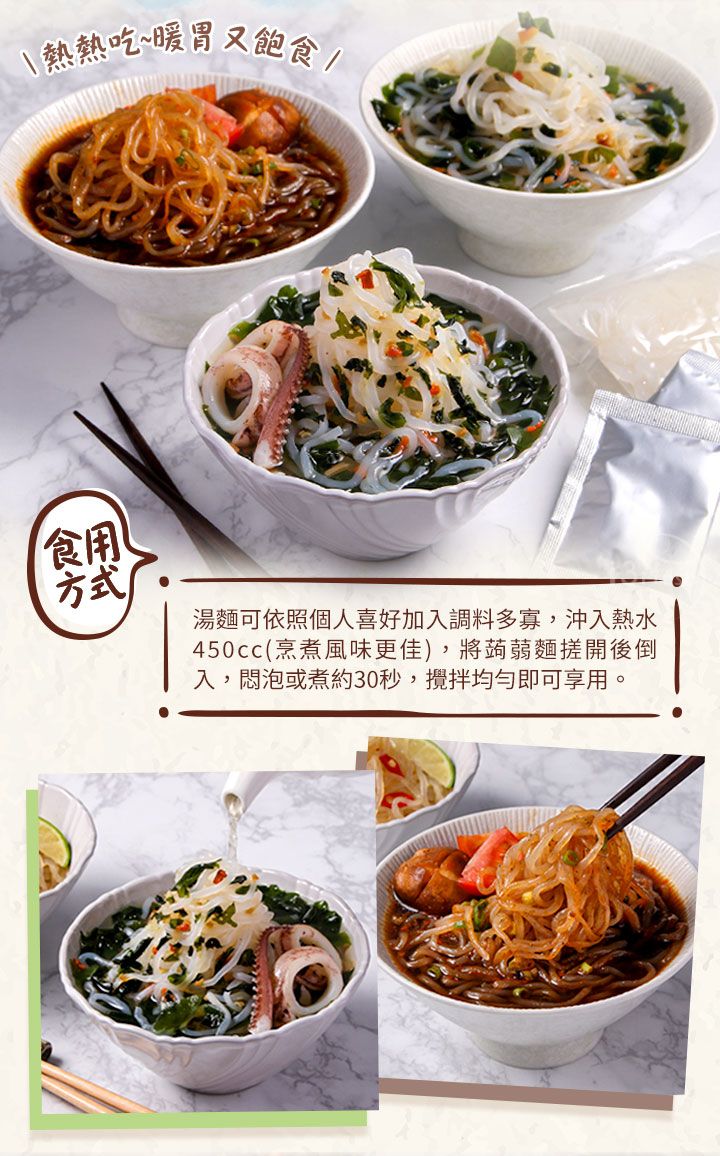 食用方式:將蒟蒻麵搓開,打開後拌入醬汁與加入喜歡食材即可食用,冷藏後風味更好。