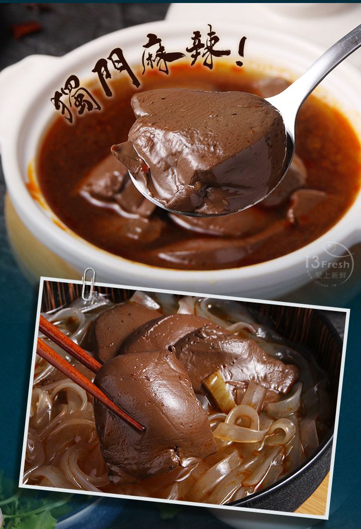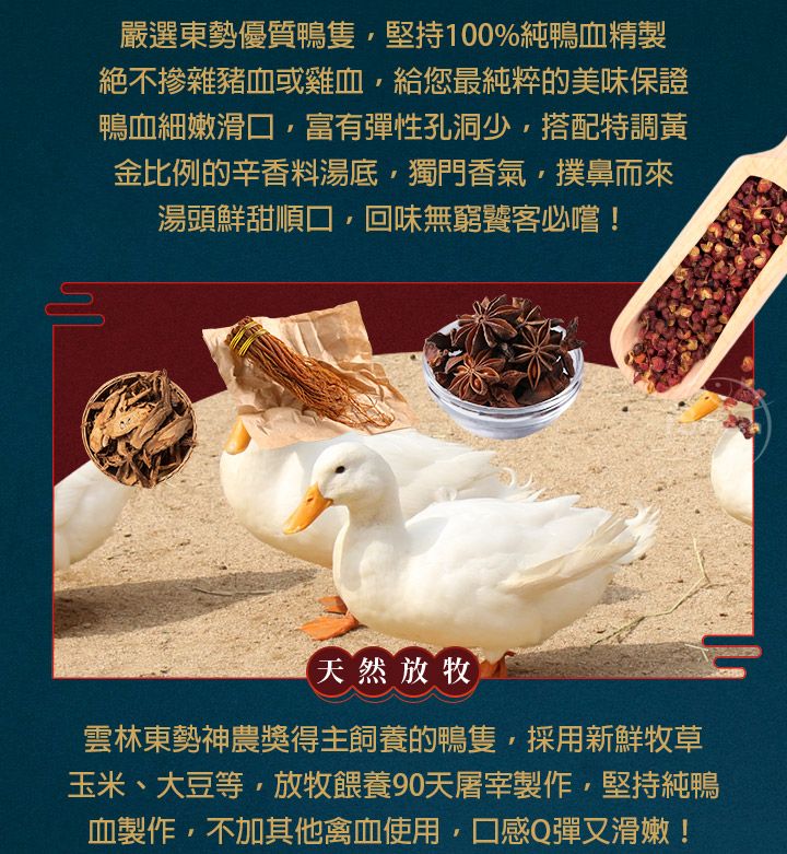 嚴選東勢優質鴨隻,100%純鴨血製作絕不摻雜豬血或雞血,鴨血細嫩滑口富有彈性,搭配特調黃金比例麻辣湯底,獨門香氣香麻溫潤,饕客必嚐!