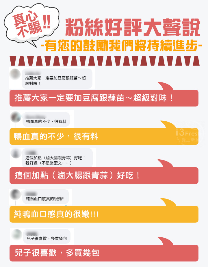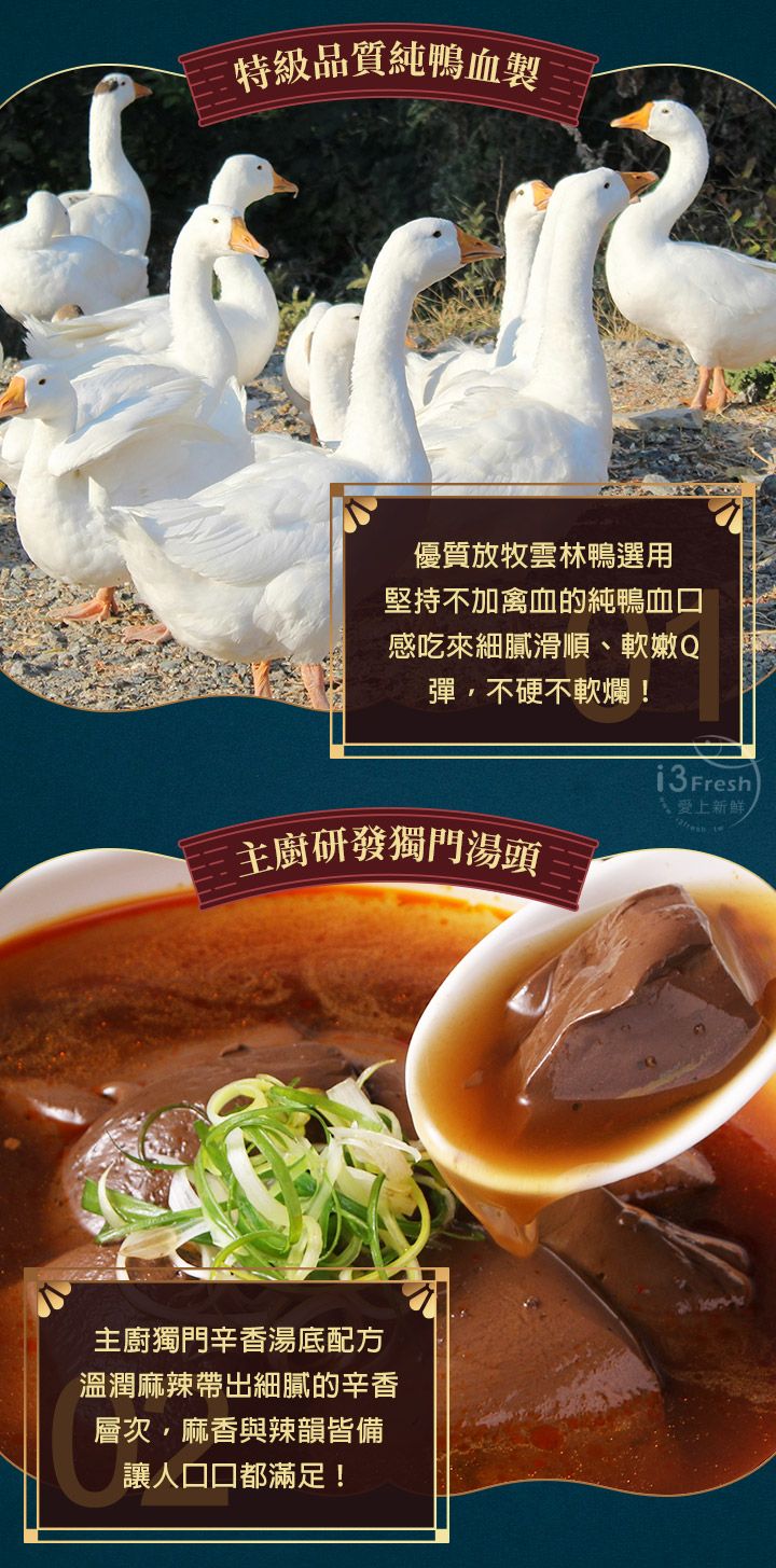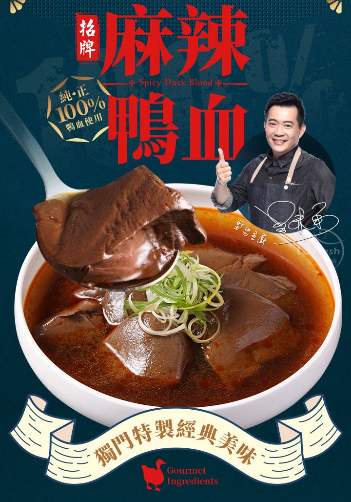 產品成分:水、鴨血(水、鴨血、鹽、多磷酸鈉、酸性焦磷酸鈉、矽樹脂、聚山梨醇酐脂肪酸酯六十五、脂肪酸山梨醇酐酯、羧甲基纖維素鈉)、麻辣醬[大豆沙拉油、純釀造黃豆醬油、L-麩酸鈉、高果糖糖漿、辣椒醬(辣椒、水、食鹽)、辣椒粉、食鹽、酵母抽出物、豆瓣醬(黃豆(基因改造)、水、小麥、食鹽)、花椒、小麥纖維、芝麻油、茴香、山奈、胡椒、5'–次黃嘌呤核苷磷酸二鈉、5'–鳥嘌呤核苷磷酸二鈉、甘草、孜然、花椒抽出物(花椒抽出物、丙二醇、脂肪酸甘油酯)、丁香、肉桂、紅椒色素(芥花油、紅椒色素)、卵磷脂]、豆瓣醬[黃豆(非基因改造)、辣椒、水、鹽、砂糖、麻油(黃豆油、芝麻油)、黏稠劑(乙醯化己二酸二澱粉、玉米糖膠)、調味劑(L-麩酸鈉、琥珀酸二鈉)、甜味劑(醋磺內酯鉀)、防腐劑(己二稀酸鉀)1.0g/kg以下、品質改良劑(偏磷酸鈉)、著色劑(食用紅色四十號)]、L-麩酸鈉、食鹽、花椒、丁香、芝麻、小茴香、沙薑、胡椒、甘草、肉桂、卵磷脂、乾薑、白胡椒、孜然、荳蔻、八角、胡荽子、砂仁。