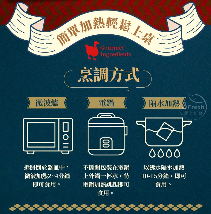 注意事項:調理包使用高溫鋁箔袋包裝,勿直接微波加熱,如需微波加熱,需拆開包裝後倒入可微波容器內即可加熱。
