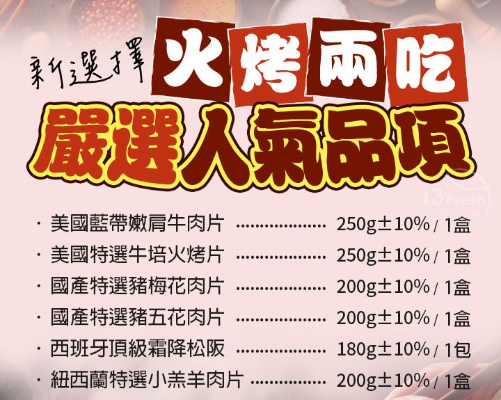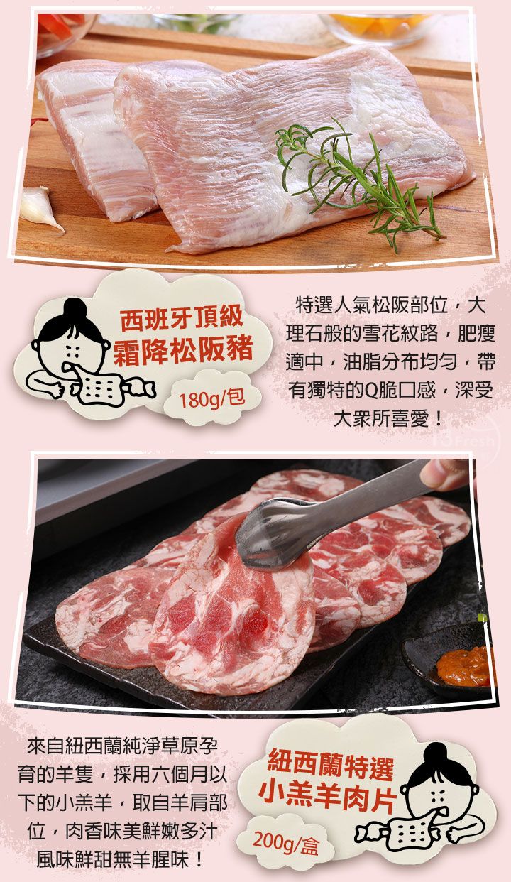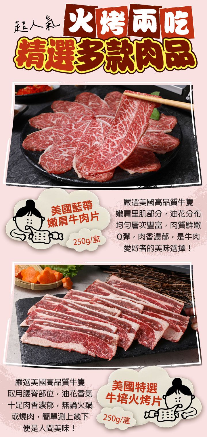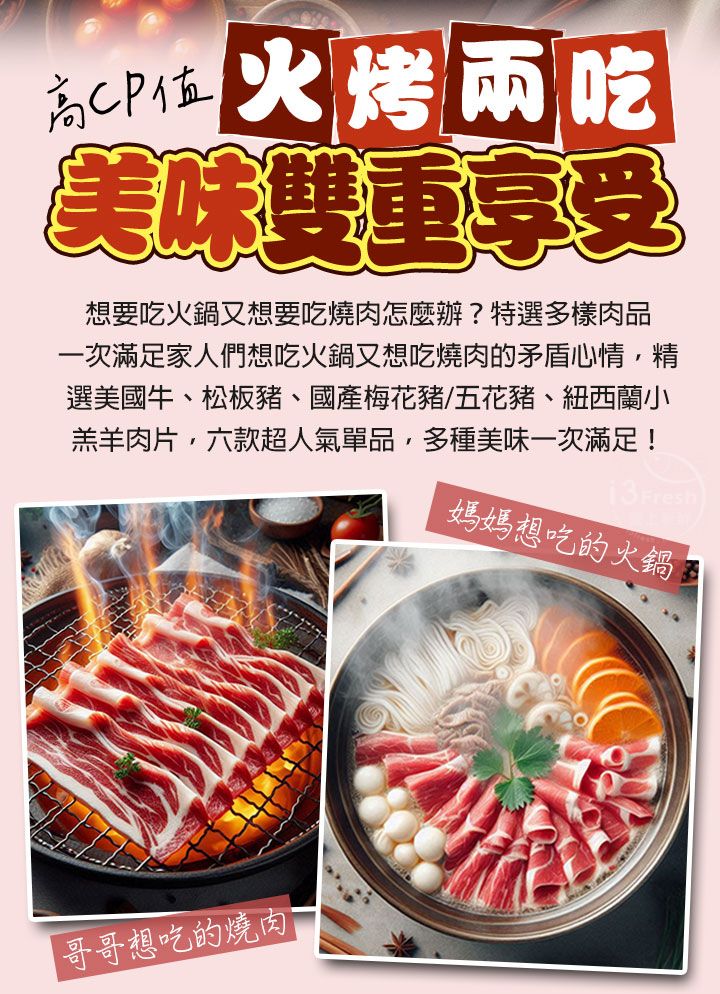 滿足家人們想吃火鍋又想吃燒肉的矛盾心情,精選美國牛、松板豬、國產梅花豬/五花豬、紐西蘭小羔羊肉片,六款超人氣單品,多種美味一次到位!
