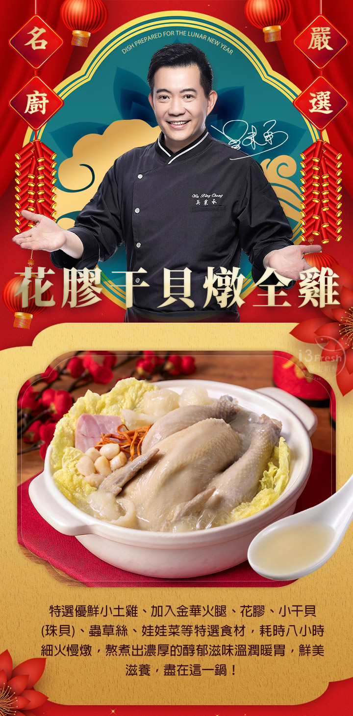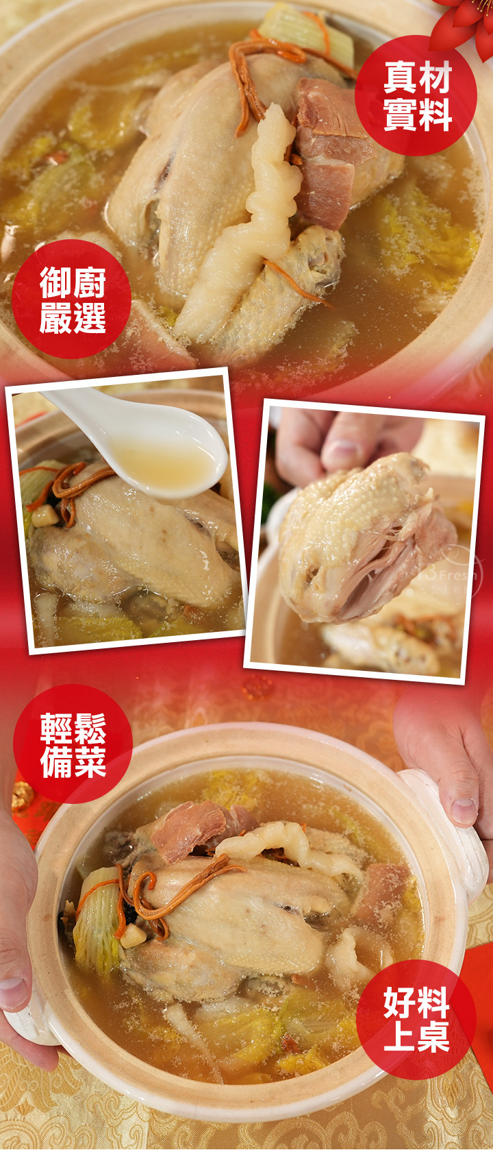 商品成分:雞高湯(水、雞骨(台灣)、豬大骨(台灣)、濃縮鮮雞汁(水、鹽、雞肉萃取物(雞肉萃取物、鹽)、L-麩酸鈉、糖、雞油、酵母萃取物(酵母萃取物、鹽)、乙醯化己二酸二澱粉、香料、調味劑(5'-次黃嘌呤核苷磷酸二鈉、5'-鳥嘌呤核苷磷酸二鈉))、明膠(來源:豬皮萃取物)、玉米糖膠、β-胡蘿蔔素(麥芽糊精、辛烯基丁二酸鈉澱粉、葵花籽油、抗氧化劑(L-抗壞血酸鈉、維生素C、維生素E)、β-胡蘿萄素))、小土雞、娃娃菜、花膠、小干貝、金華火腿(豬肉(台灣)、精鹽、亞硝酸鈉(0.07g/kg以下))、蛹蟲草子實體(Cordyceps militaris,固態培養)、糖、鹽
