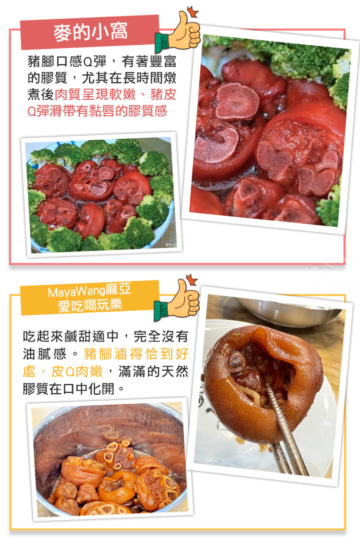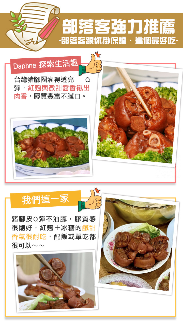 商品成分:豬腳圈(台灣)、水、醬油(大豆、小麥、食鹽、砂糖、調味劑(L-麩酸鈉、胺基乙酸)、著色劑(焦糖色素)、甜味劑(甘草酸鈉))、米酒(水、米、精製食用酒精)、醬油膏(釀造醬油(水、脫脂大豆片、小麥)、水、蔗糖、鹽、乙醯化己二酸二澱粉、糯米、調味劑(琥珀酸二鈉、胺基乙酸、DL-胺基丙酸、5'-次黃嘌呤核苷磷酸二鈉、5'-鳥嘌呤核苷磷酸二鈉)、著色劑(焦糖色素)、品質改良劑(無水碳酸鈉)、酵母粉、甜味劑(甘草酸鈉))、紅蔥頭、蒜頭、蔥、薑、冰糖、紅麴米(紅麴菌、米)、鹽