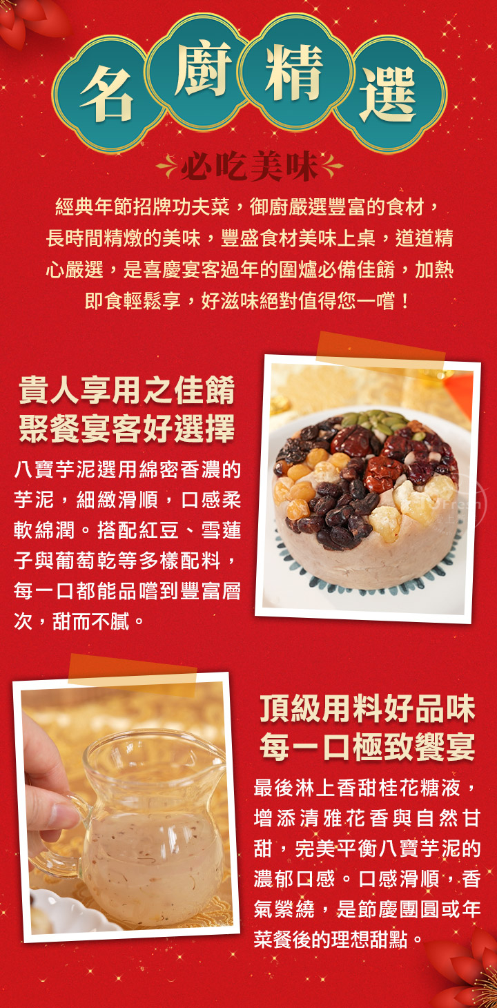 八寶芋泥傳統的台菜甜點,平常不易見綿密香濃的芋泥鋪上紅豆、雪蓮子、葡萄乾等,最後淋上香甜的桂花糖液,為過年大魚大肉後畫下甜蜜的句點!