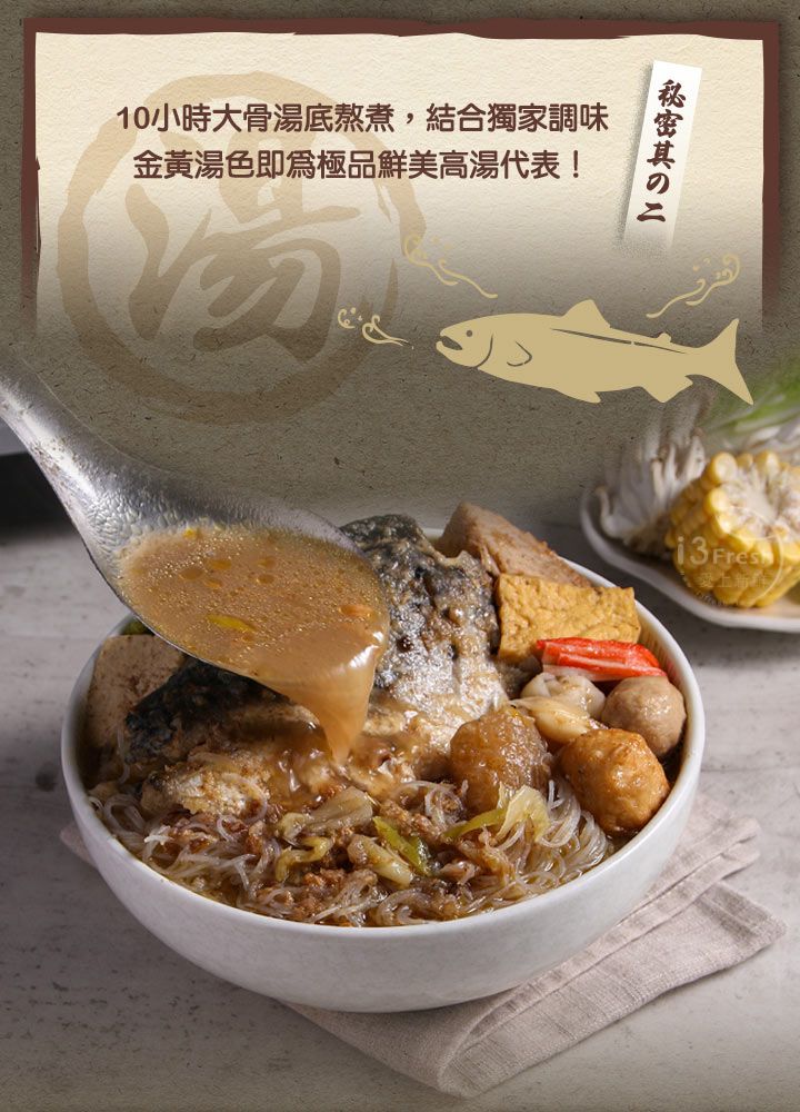 特選大份量鮭魚頭炸至金黃逼出豐富油脂呈現酥香風味, 湯底是每日熬煮高過10小時的大骨湯底,湯料魚頭分開真空包裝,鎖住新鮮口感!