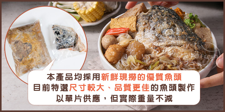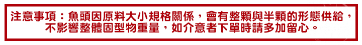 注意事項:魚頭因原料大小規格關係,會有整顆與半顆的形態供給,不影響整體固型物重量,如介意者下單時請多加留心。