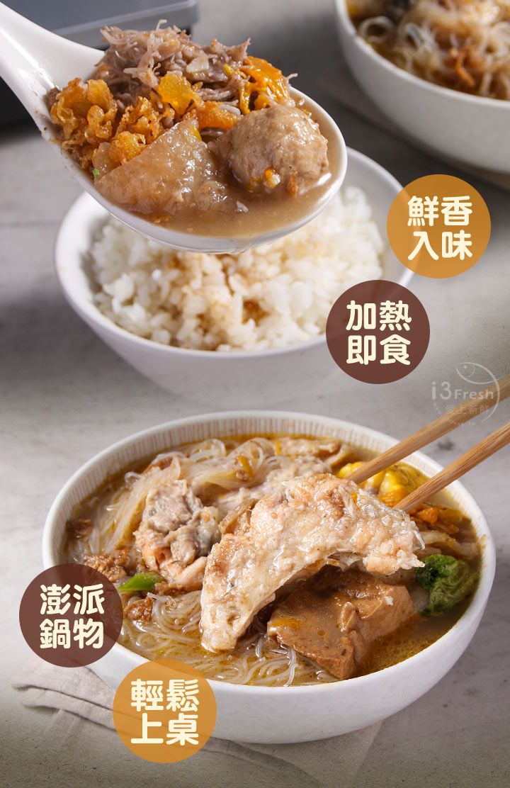 食用方式:冷藏解凍後,拆袋倒入可加熱容器鍋內,以瓦斯爐、電爐等中小火加熱約20-30分鐘(可視情況調整)到沸騰即可食用。