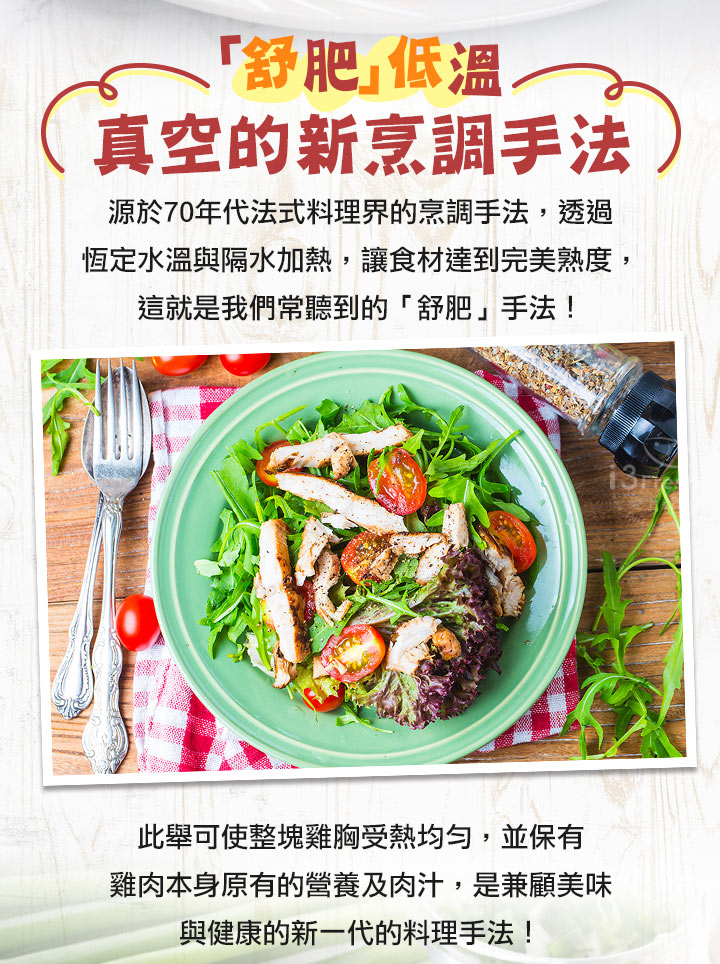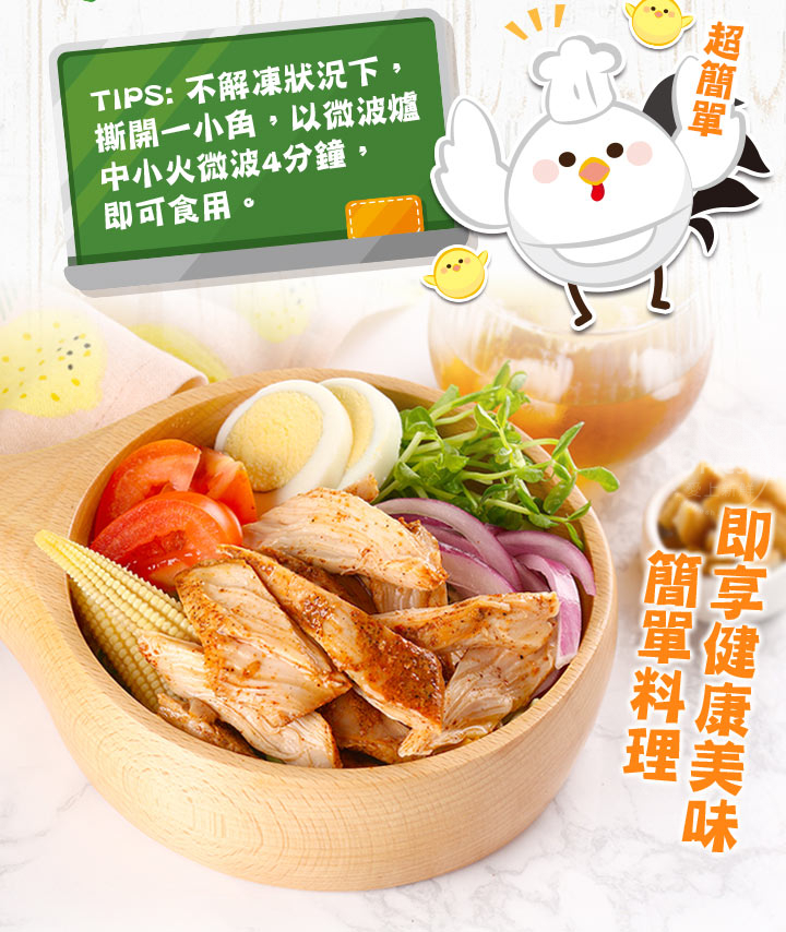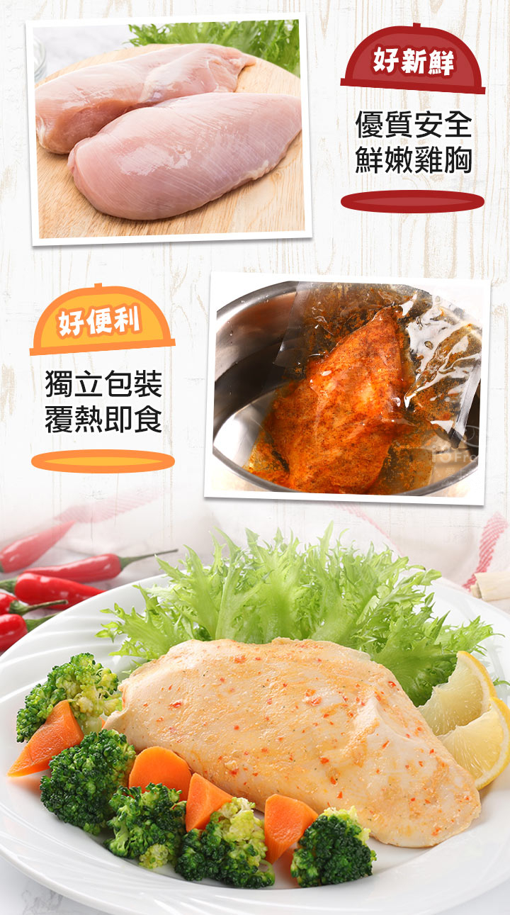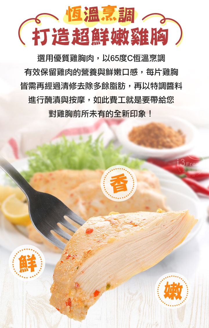 選用優質雞胸肉,以65度C恆溫烹調,有效保留雞肉的營養與鮮嫩口感,再以特調醃料進行醃漬與按摩,就是要帶給您對雞胸前所未有的全新印象!