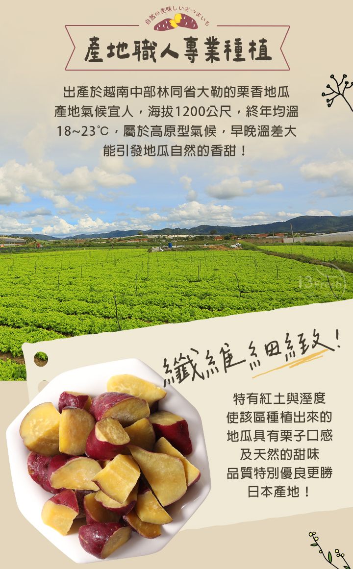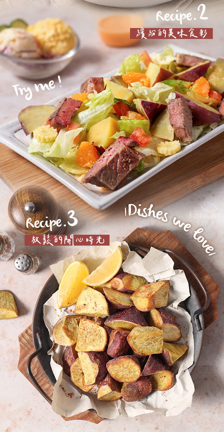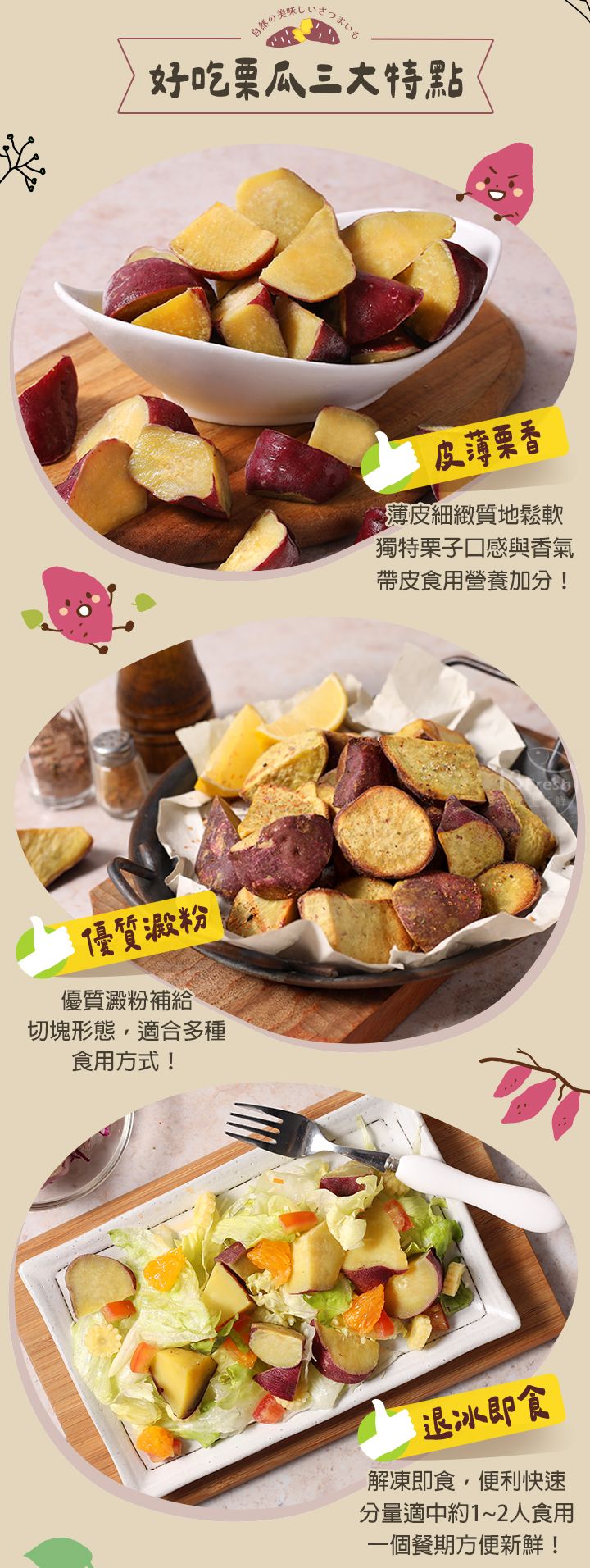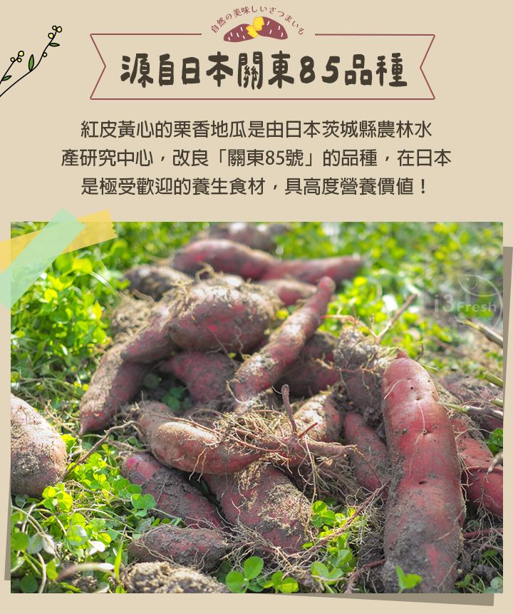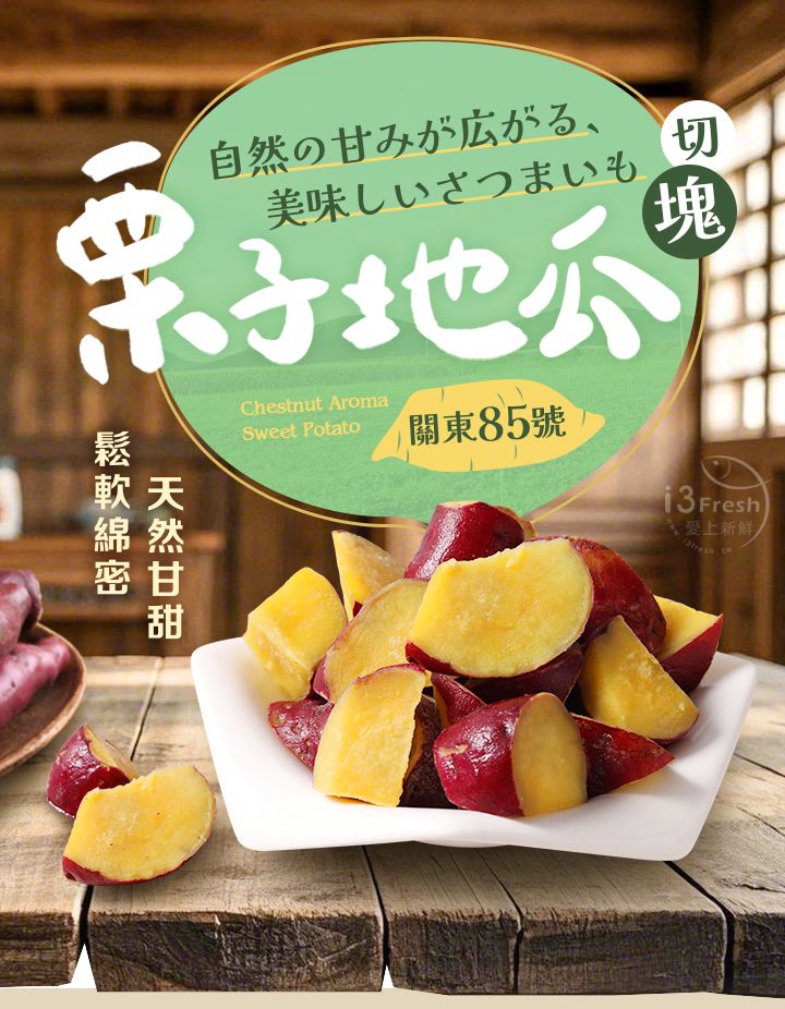 日本品種紅皮栗香地瓜,獨特的栗子口感與香氣,皮薄美味肉質細緻,不規則滾刀切塊,無論是備餐、沙拉、氣炸滿足多種料理應用!