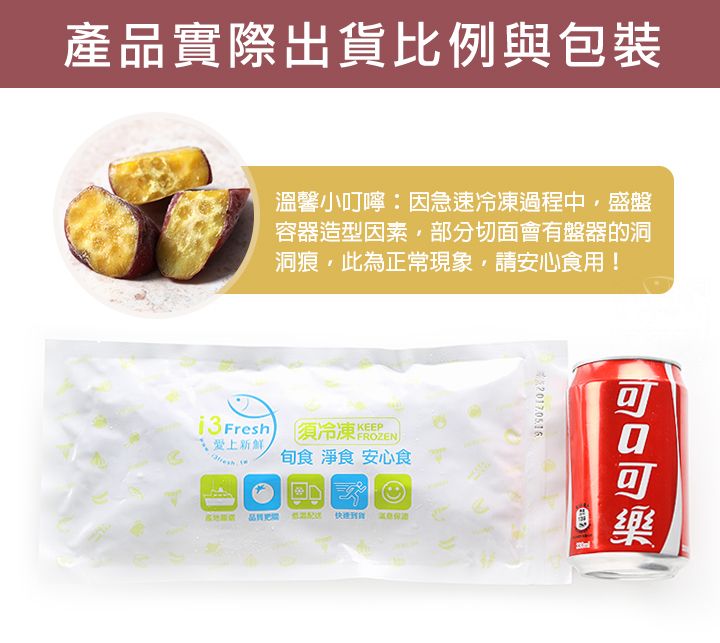 1. 此為不規則滾刀切塊,部分切面會有急凍前盤器的洞洞痕此為正常現象,請安心食用。