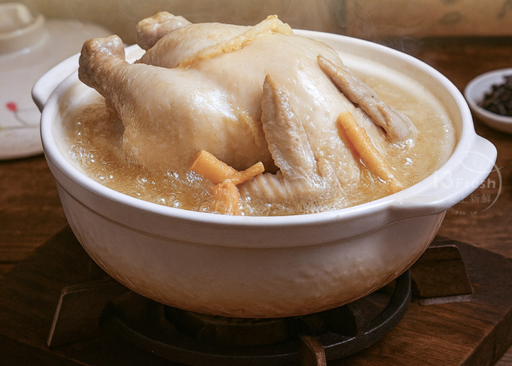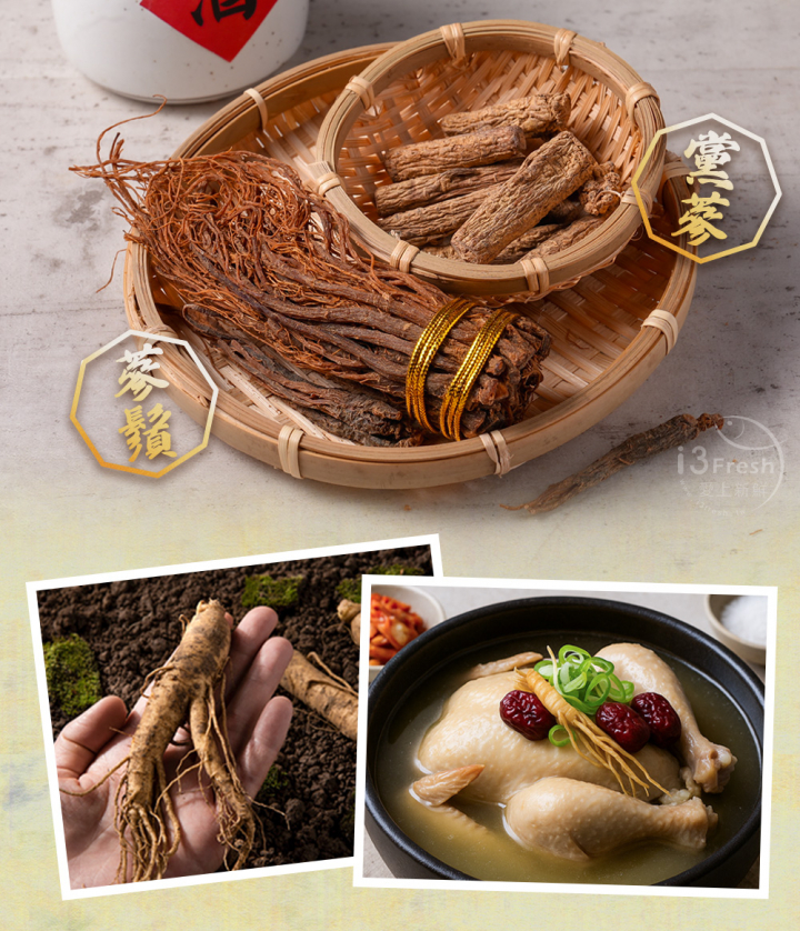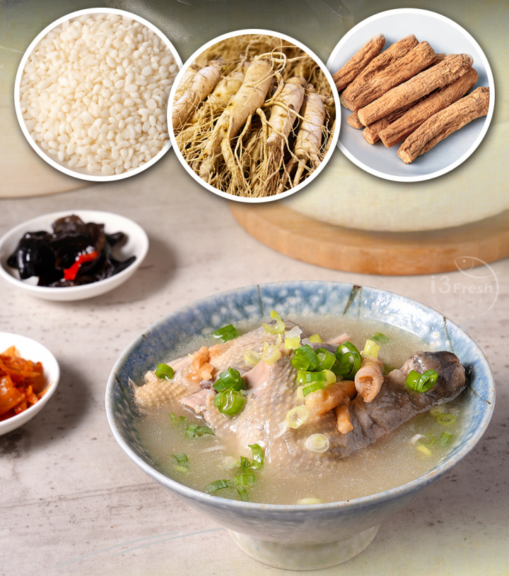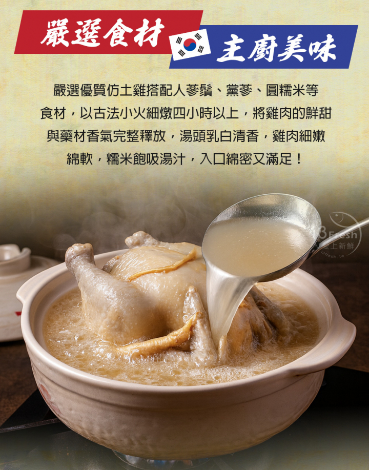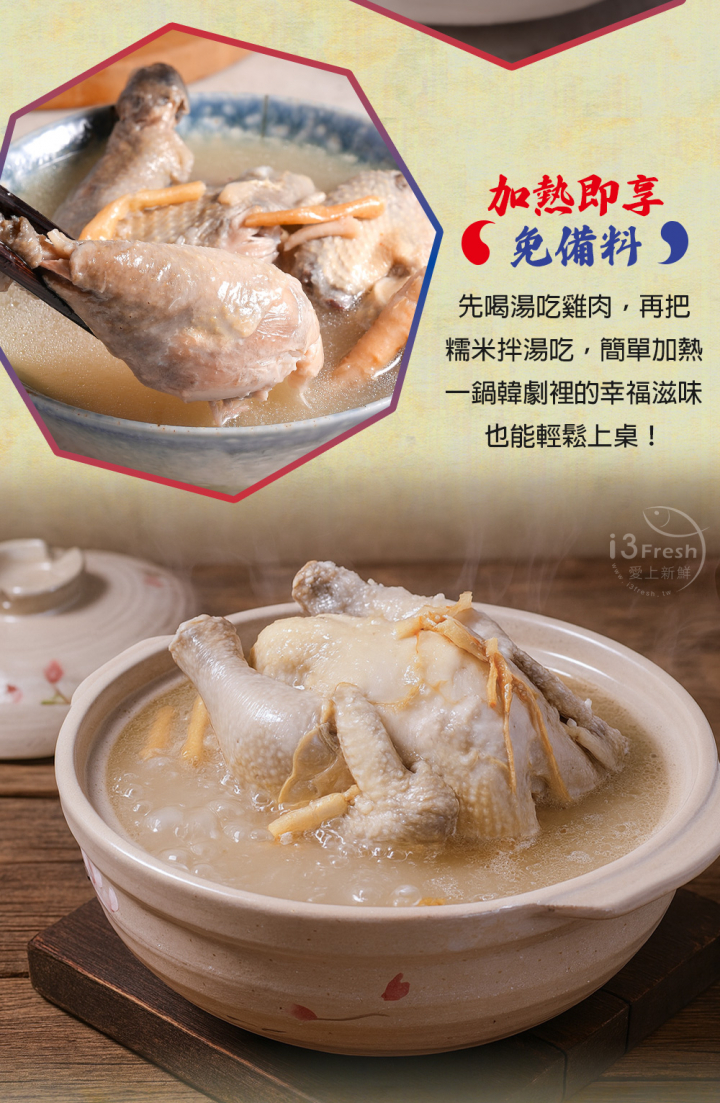 產品成分:水、仿土雞、糯米、米酒、頂上高湯粉【L-麩酸鈉、砂糖、食鹽、酵母抽出物、麥芽糊精、洋蔥粉、蒜粉、香菇粉、5'-鳥嘌呤核苷磷酸二鈉、5'-次黃嘌呤核苷磷酸二鈉、水解植物大豆蛋白粉、玉米糖膠、青蔥粉、香料、糊精、耐炸油(軟質棕櫚油、大豆油、芥花油)、甘草酸鈉(甜味劑)】、人蔘鬚、黨蔘、鮮雞風味粉【食鹽、L-麩酸鈉、麥芽糊精、酵母抽出物、砂糖、水解植物大豆蛋白粉、洋蔥粉、香料】、食鹽、人蔘香料【葡萄糖、丙二醇、磷酸鈣、香料】