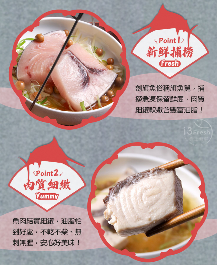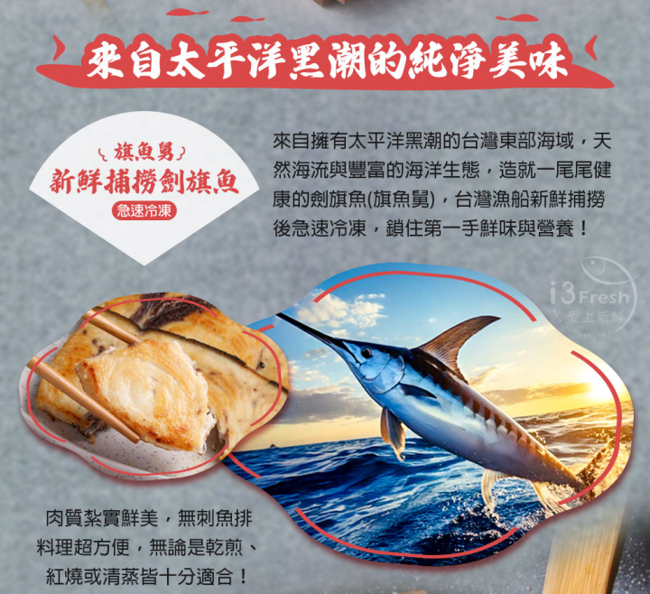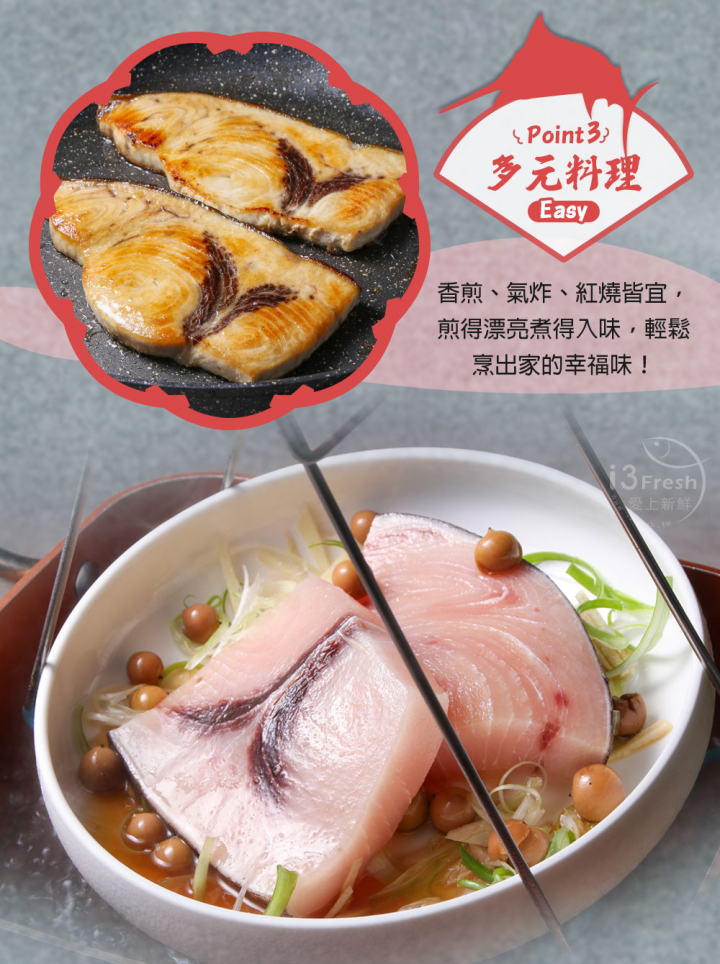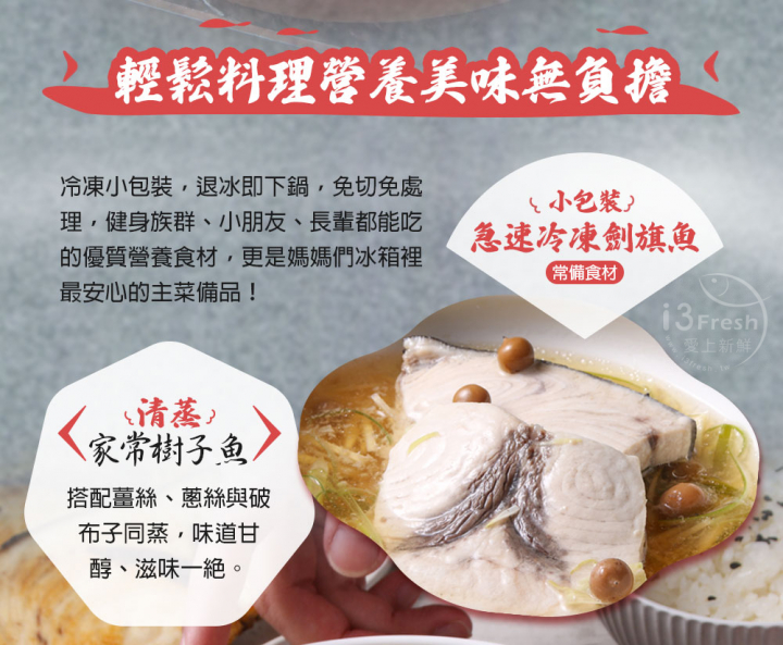 劍旗魚魚肉結實細緻,油脂恰到好處,不乾不柴、無刺無腥,冷凍小包裝退冰即下鍋,免切處理超方便!