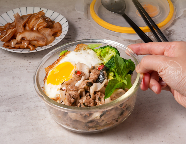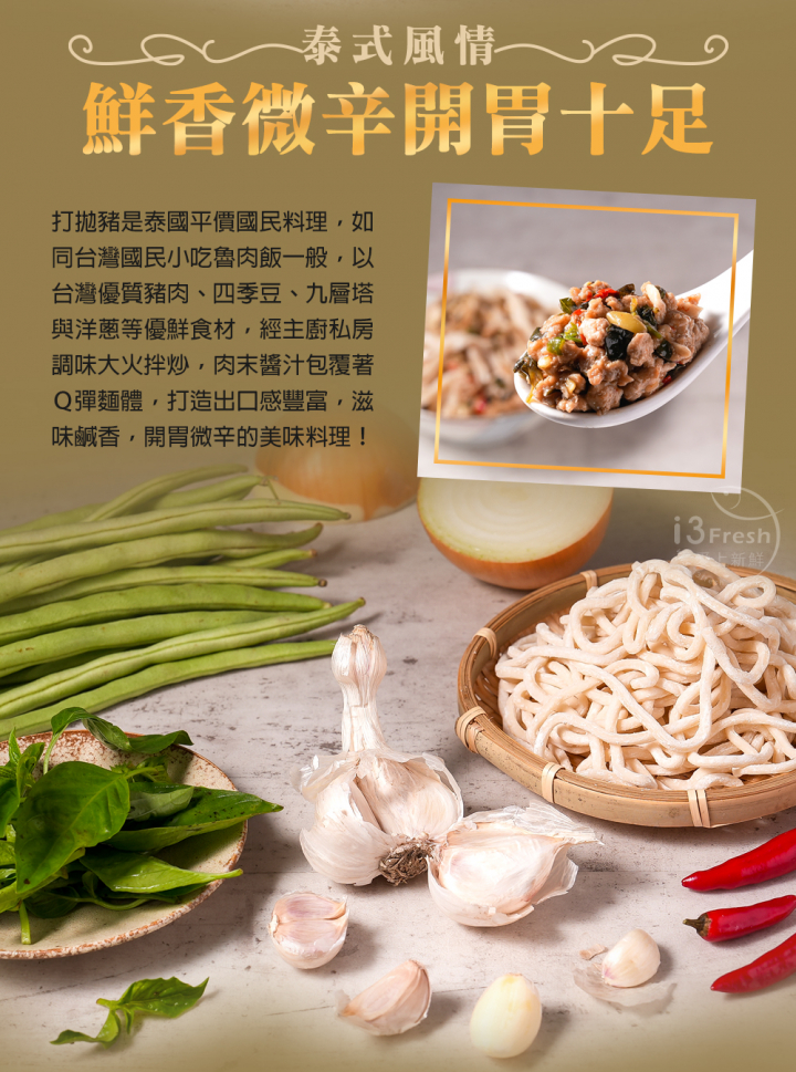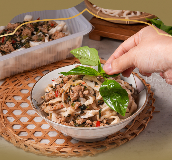 成分 : 麵條【麵粉(小麥、維生素C(抗氧化劑))、水、鹽】、豬肉(台灣)、洋蔥、九層塔、四季豆、蒜、辣椒、水、蠔油【牡蠣萃取物、醬油(大豆、小麥、鹽)、糖、乙醯化己二酸二澱粉、玉米澱粉、葡萄糖酸-δ內酯】、醬油【水、非基因改造黃豆(高蛋白豆片)、小麥、食鹽、酒精】、大豆沙拉油、糖