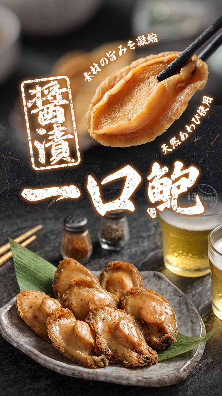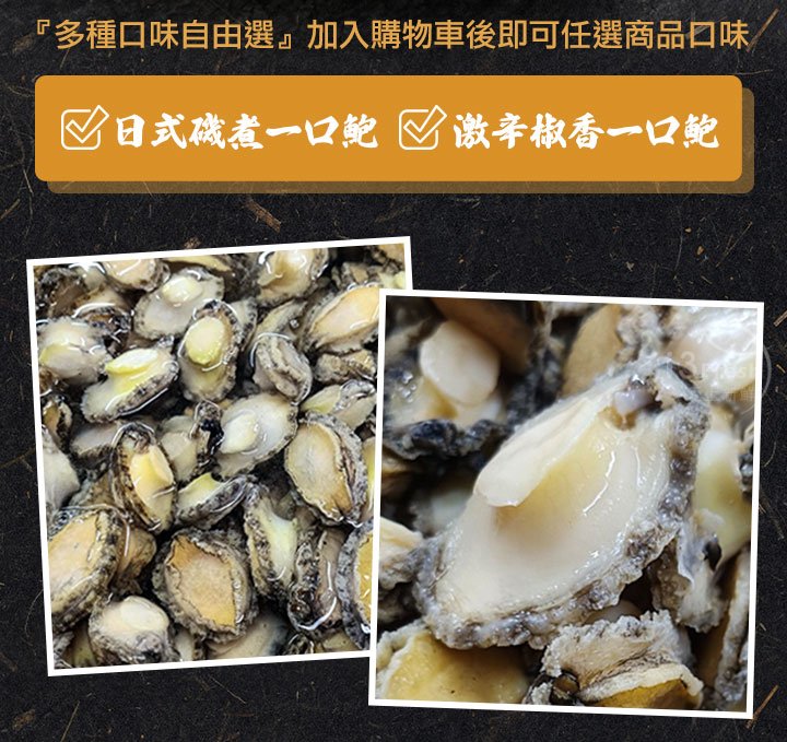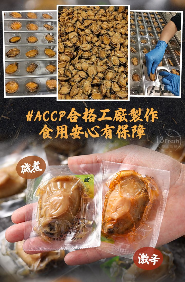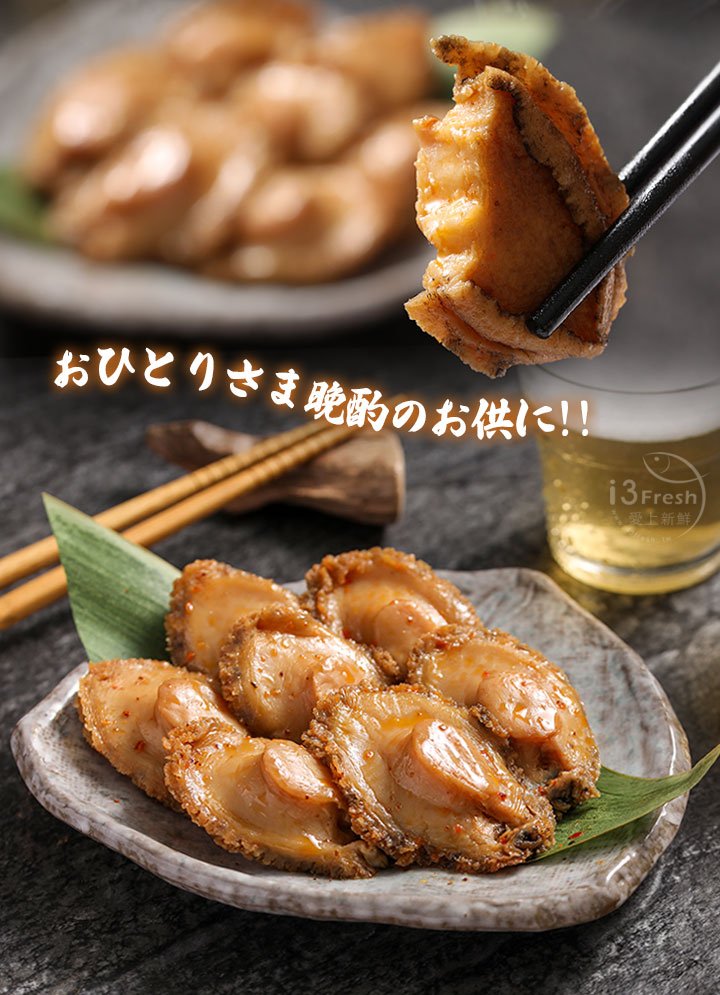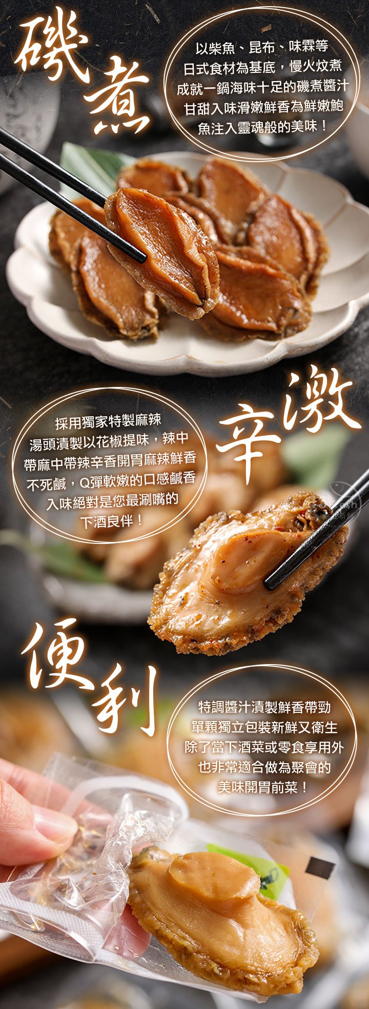 嚴選優質進口鮑魚清肉,以柴魚、昆布、花椒、麻辣調料等食材依黃金比例調味後,再放入鮮嫩鮑魚長時間醃漬,顆顆鮮香入味,口感Q彈扎實,單顆真空包裝新鮮衛生,打開即食免沾手!