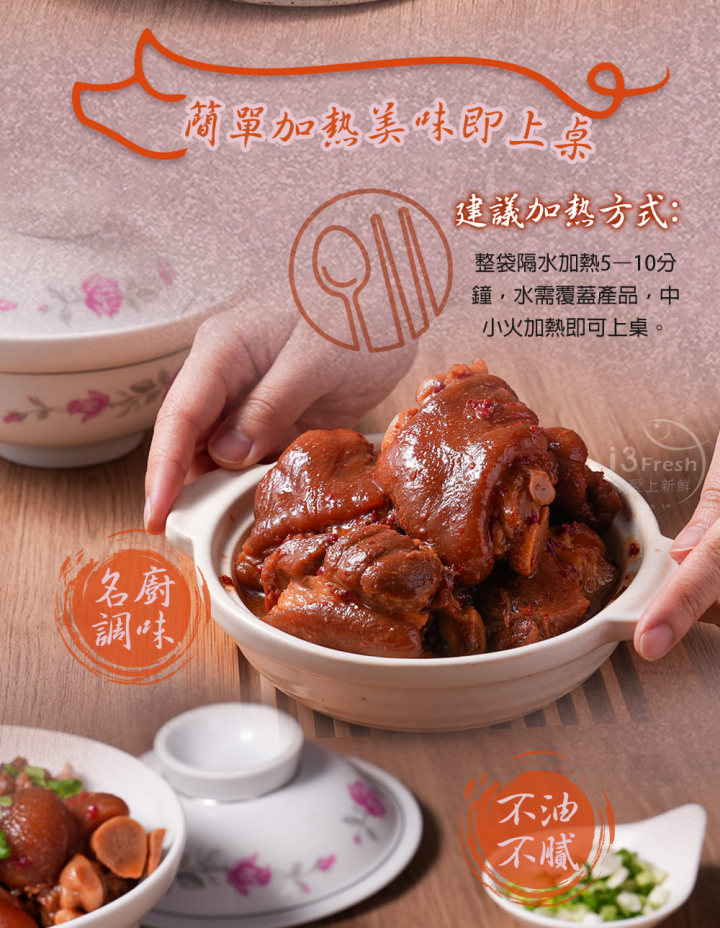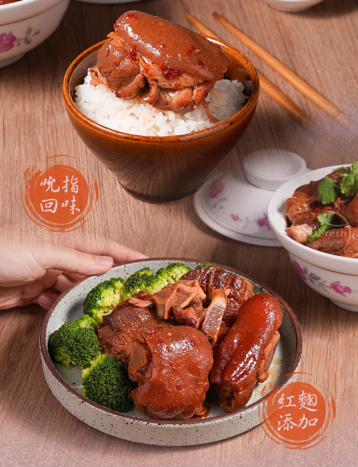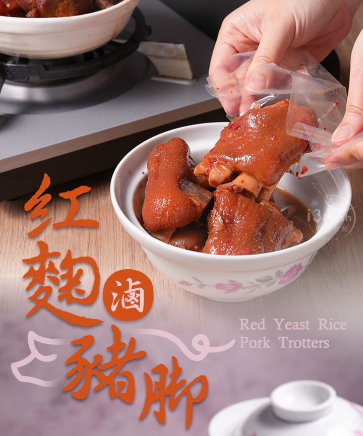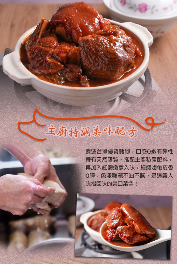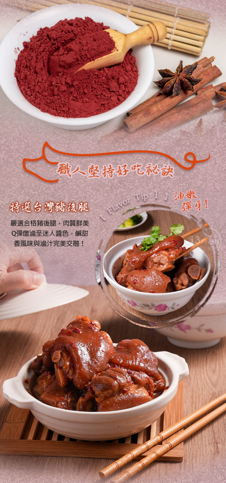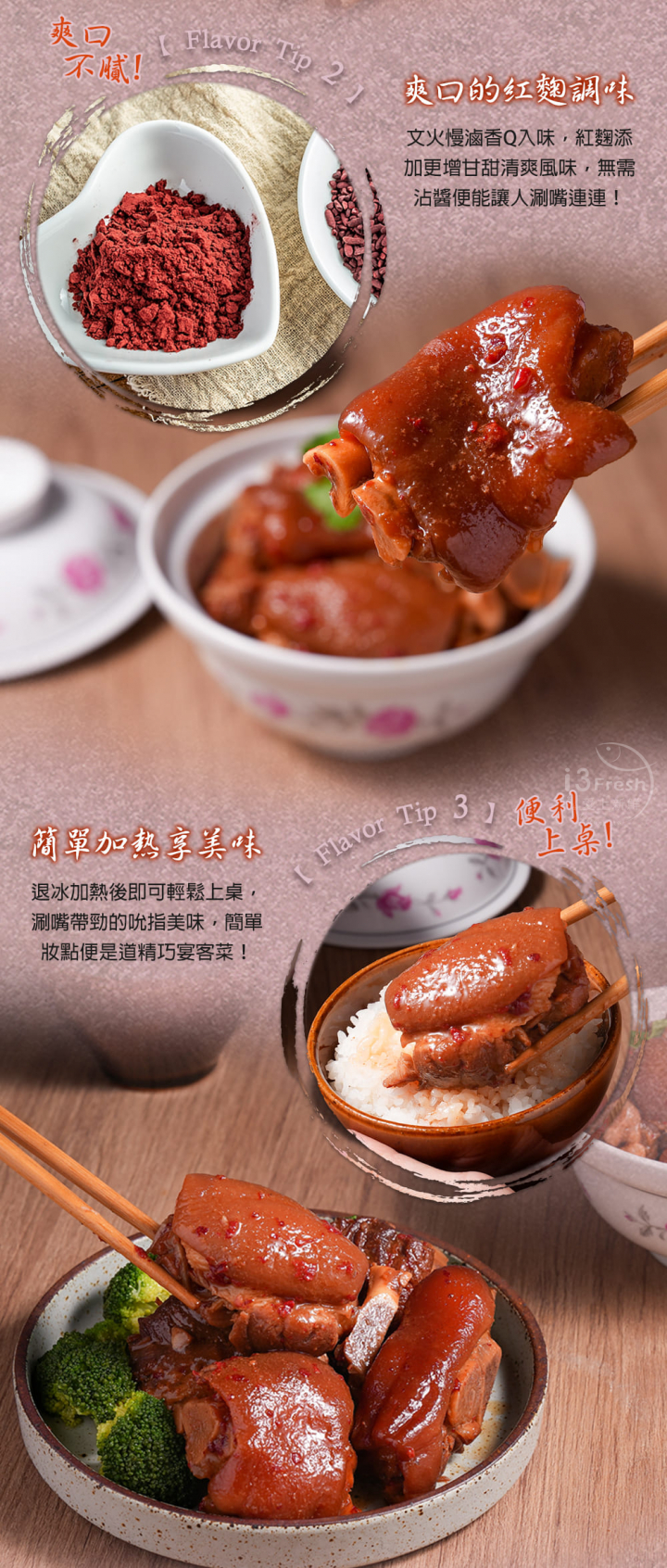 嚴選台灣優質豬腳,口感Q嫩有彈性,帶有天然膠質,文火慢滷香Q入味,紅麴添加更增甘甜清爽風味,無需沾醬便能讓人涮嘴連連!