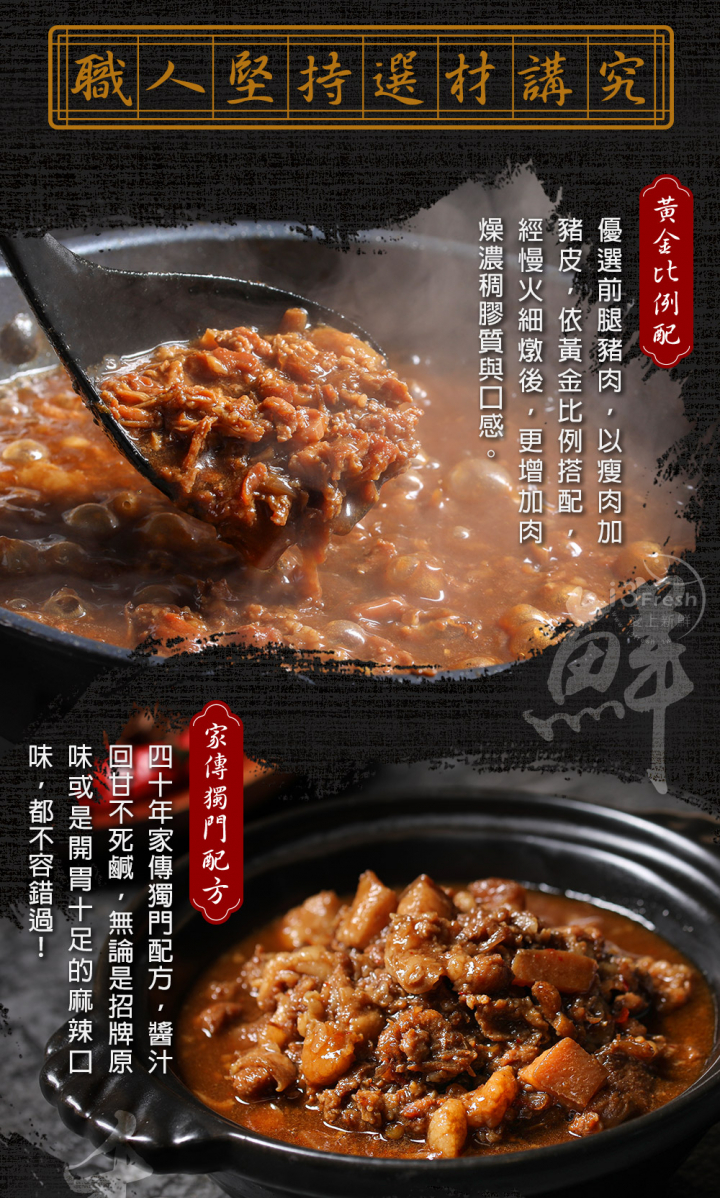 嚴選新鮮前腿豬肉,以瘦肉 8: 豬皮 2 的黃金比例搭配蔥酥、花椒等天然食材,慢火細燉達六小時,醬汁濃郁香醇、肉質軟嫩,深受消費者所喜愛!