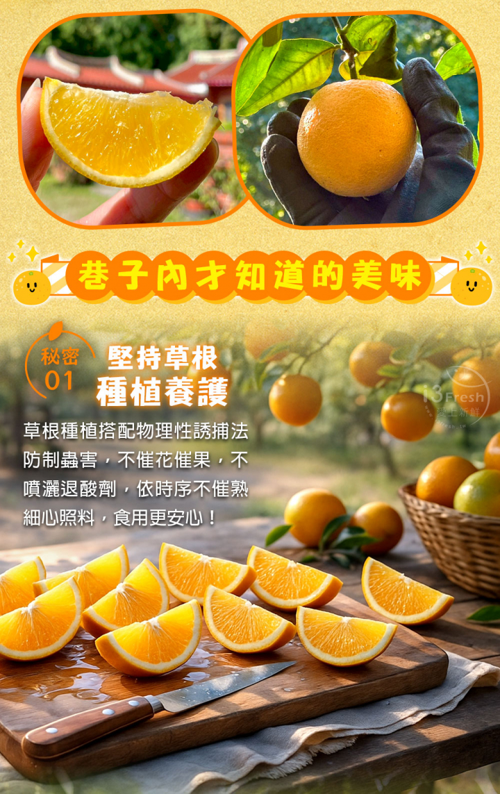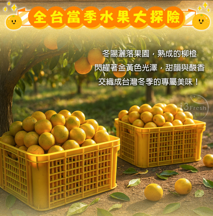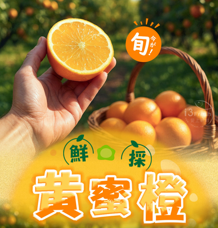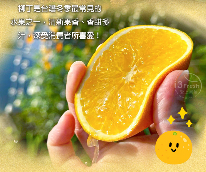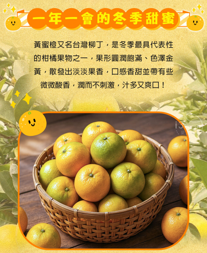 黃蜜橙又名台灣柳丁,是冬季最具代表性的柑橘果物之一,果形圓潤飽滿、色澤金黃,散發出淡淡果香,口感香甜並帶有些微微酸香,汁多又爽口!