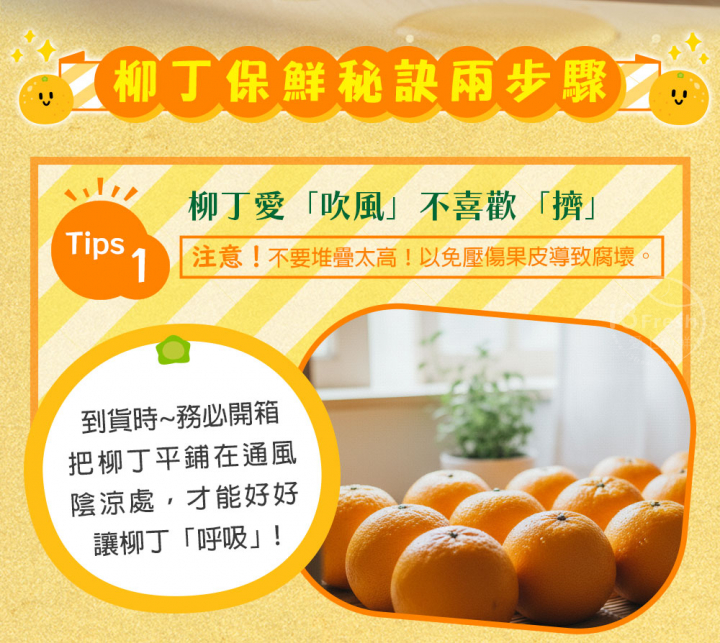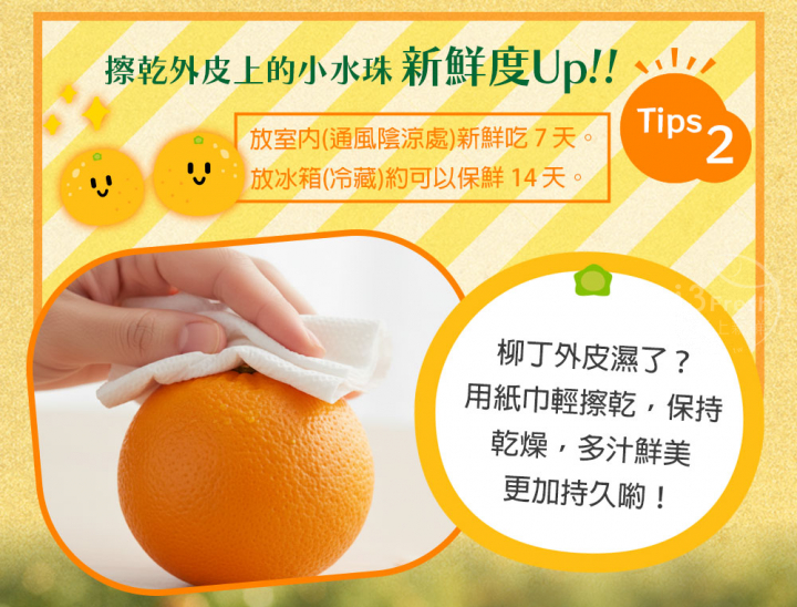 保存方式:1.將黃蜜橙(柳丁)平放在通風陰涼處,避免陽光直射。2.不要堆疊太高,以免壓傷果皮導致腐壞。3.若表皮略有水氣,可用紙巾輕輕擦乾。