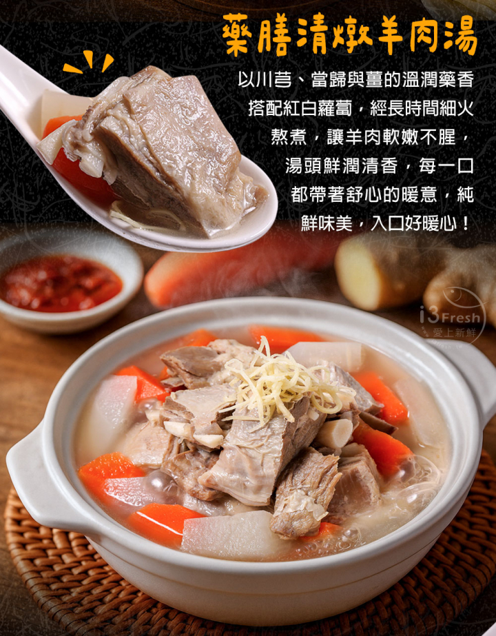 產品成分:水、羊肋排(產地:澳洲)、羊丁骨(產地:澳洲)、白蘿蔔、紅蘿蔔、L-麩酸鈉、鹽、薑、糖、川芎、當歸