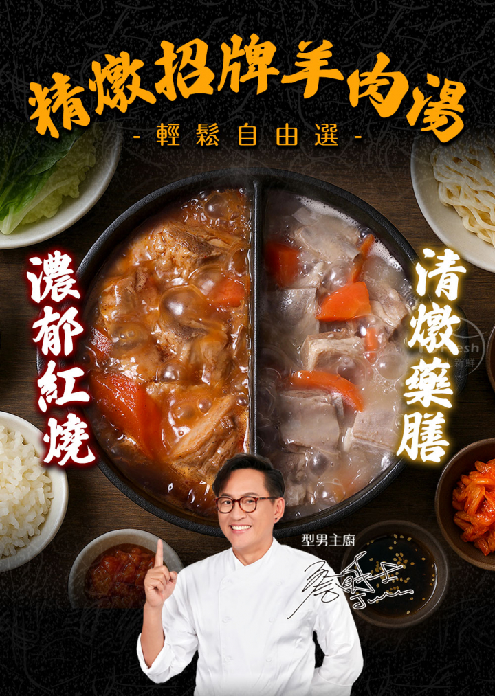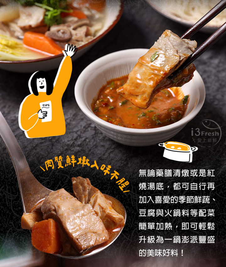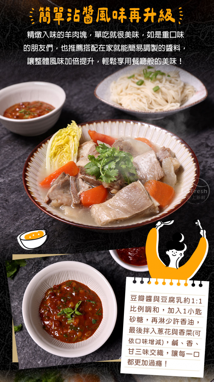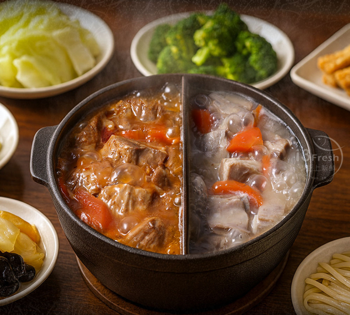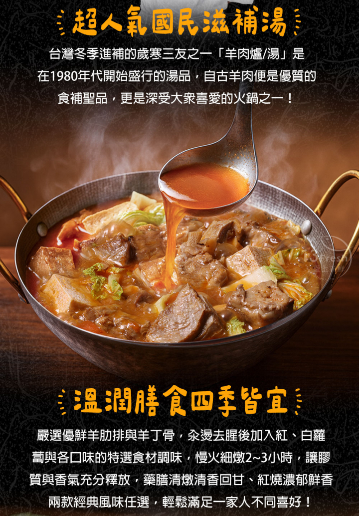 嚴選優鮮羊肋排與羊丁骨,慢火細燉 2~3小時,讓膠質與香氣充分釋放,藥膳清燉清香回甘、紅燒濃郁鮮香兩款經典風味任選,輕鬆滿足一家人不同喜好!