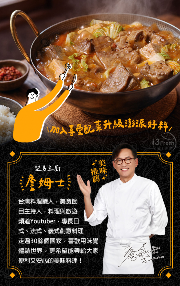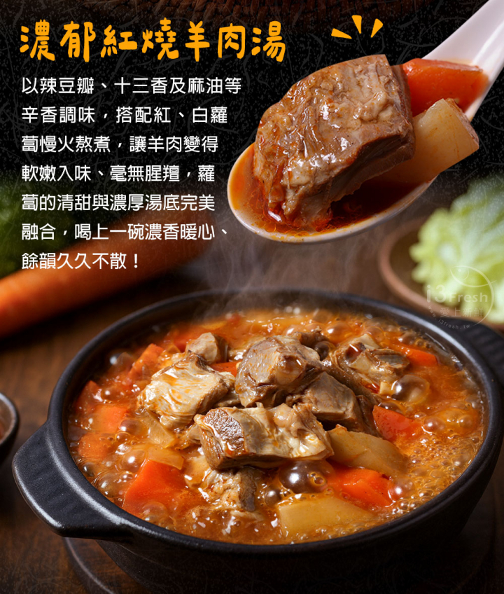 產品成分:水、羊肋排(產地:澳洲)、羊丁骨(產地:澳洲)、白蘿蔔、紅蘿蔔、辣豆瓣(辣椒、非基因改造黃豆、水、麻油、味精(L-麩酸鈉)、5’-次黃嘌呤核苷磷酸二鈉、5’-鳥嘌呤核苷磷酸二鈉、鹽、黏稠劑(乙醯化己二酸二澱粉、三仙膠)、糖、乳酸)、L-麩酸鈉、醬油、十三香(八角、小茴香、花椒、高良薑、橘皮、黑胡椒、肉豆蔻、肉桂、乾薑、甘草、砂仁、丁香、白芷)、糖、八角