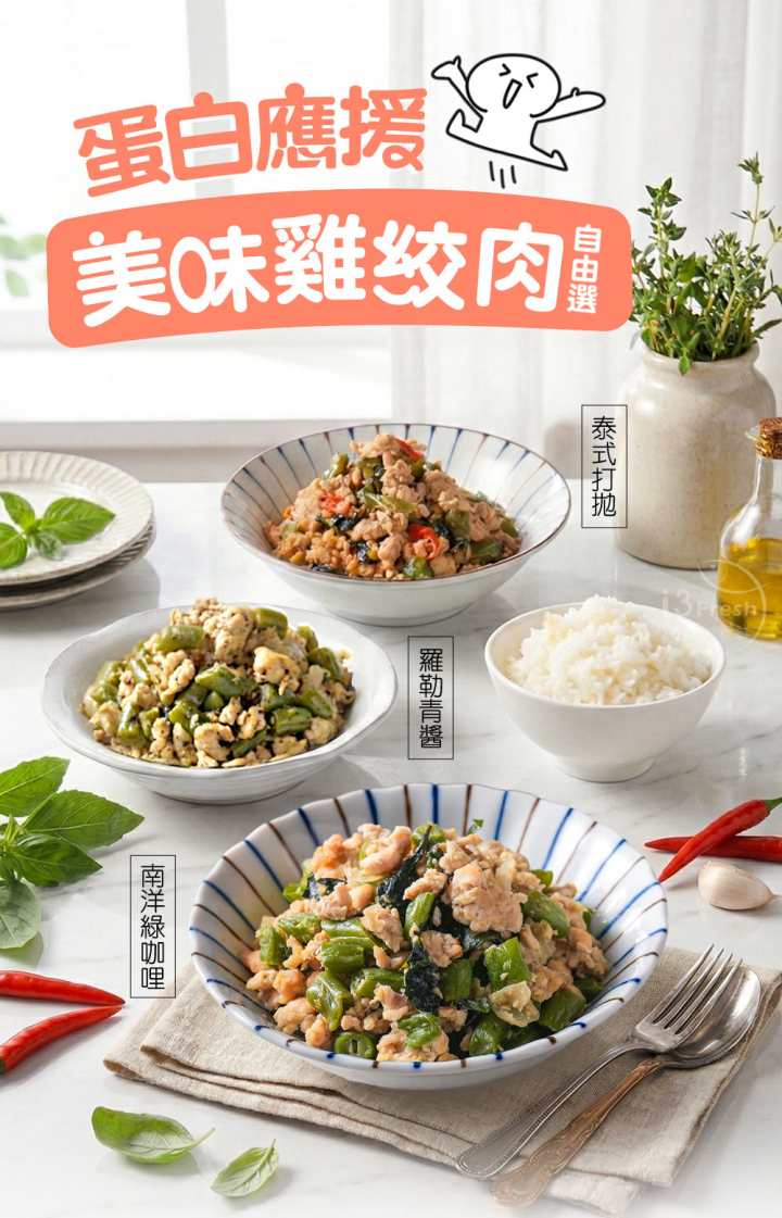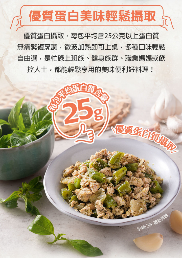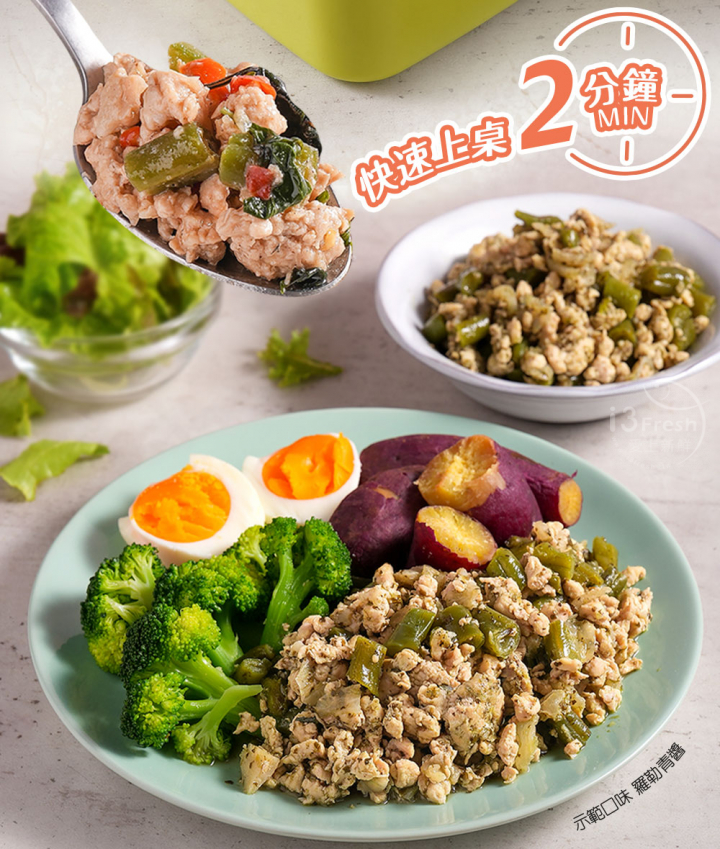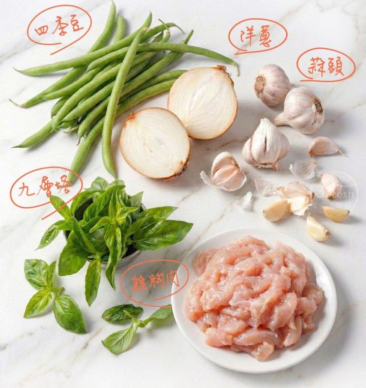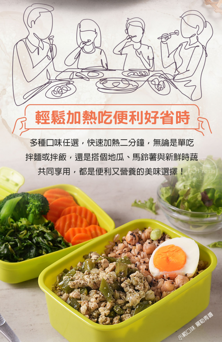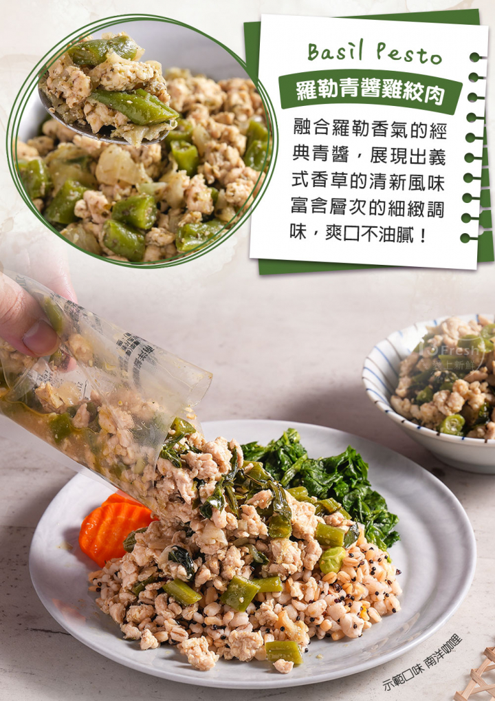 產品成分:雞胸肉、四季豆、洋蔥、青醬[九層塔、芥花油、食鹽、大蒜、洋香菜葉、香料(玉米油、香料)、白胡椒]、橄欖粕油(精製橄粕油、特級初榨橄欖油)、蒜、醬油、鹽、砂糖、羅勒香料