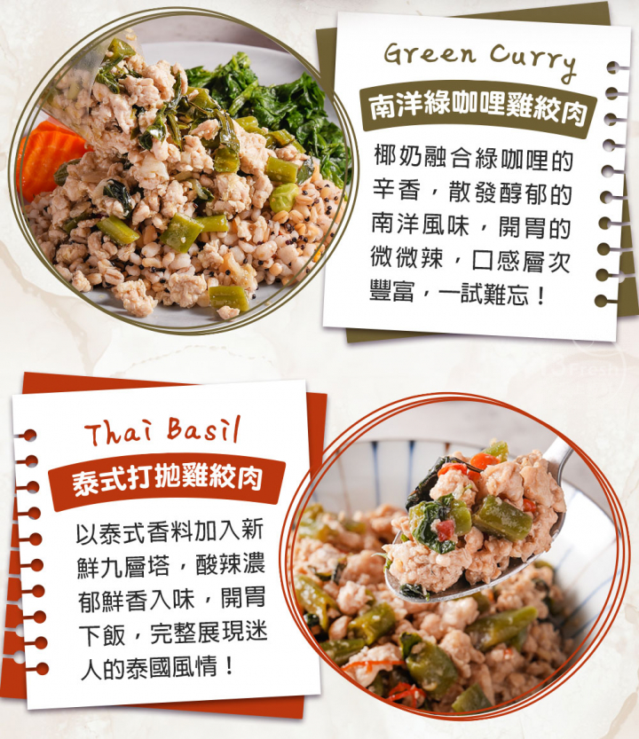 產品成分:雞胸肉、四季豆、洋蔥、椰漿(椰子萃取物、水)、綠咖哩[綠辣椒、蒜頭、香茅、紅蔥頭、鹽、南薑、麻瘋柑、蝦醬(蝦、鹽)、香辛料(馬芹粉、芫荽粉)]、蒜、橄欖粕油(精製橄粕油、特級初榨橄欖油)、九層塔、糖、魚露(鯷魚萃取物、鹽、糖)、鹽