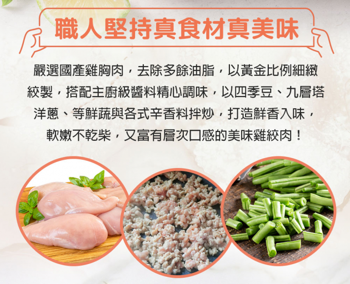 嚴選國產雞胸肉,以黃金比例細緻絞製,搭配主廚級醬料精心調味,打造鮮香入味,軟嫩不乾柴,又富有層次口感的美味雞絞肉!