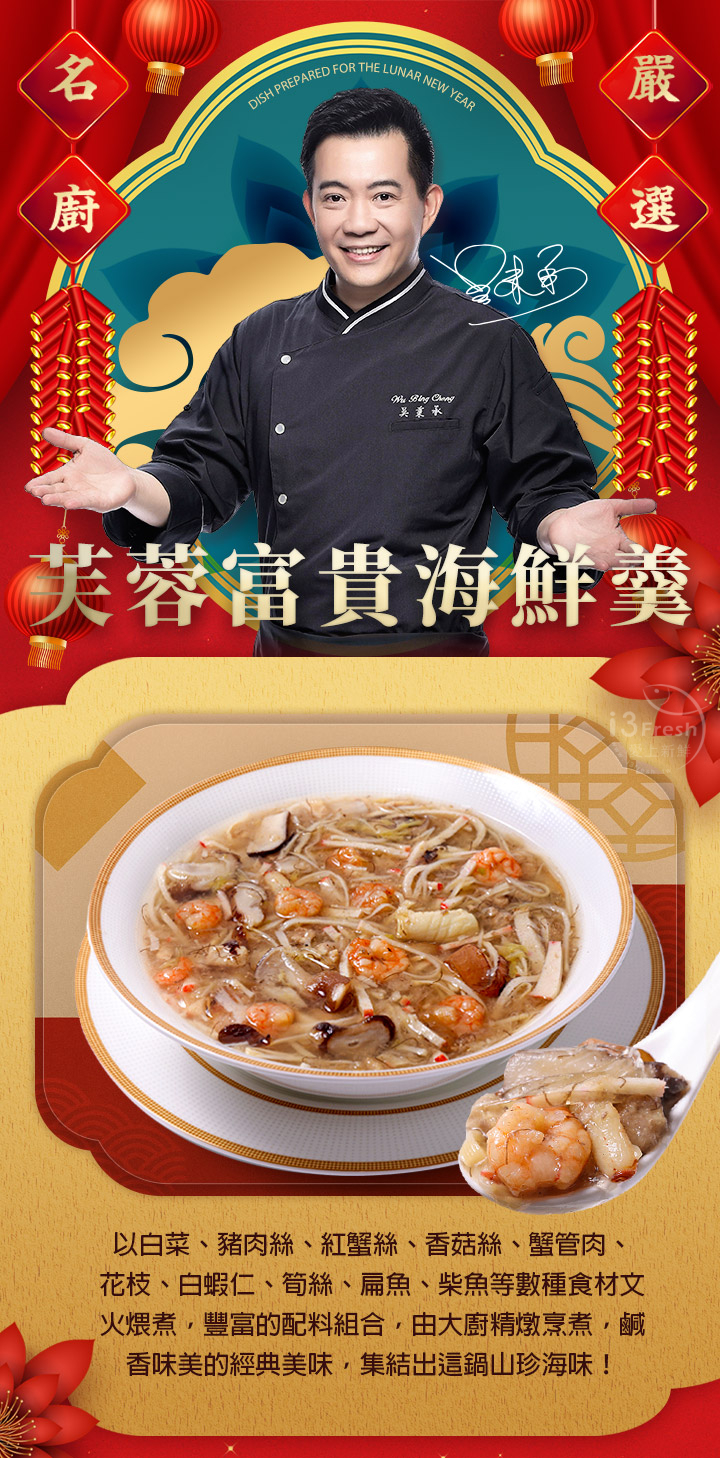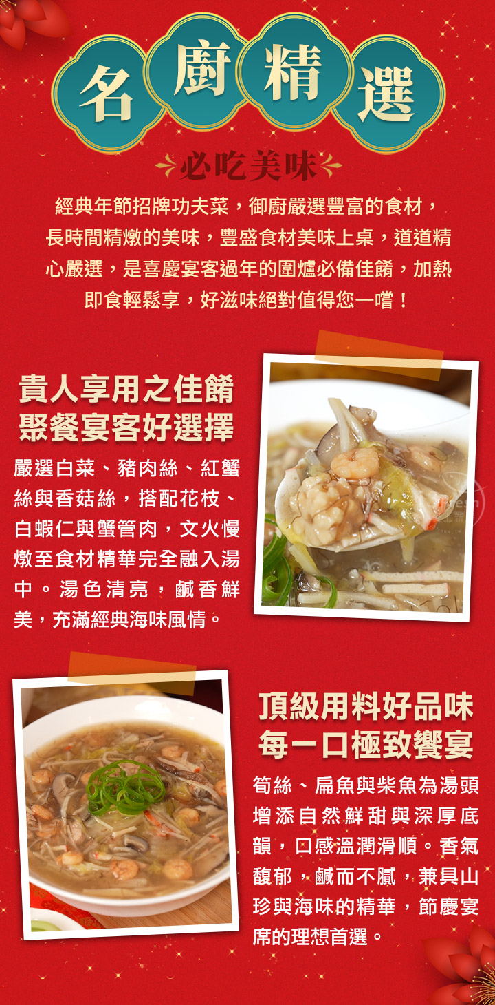 數種食材文火煨煮,豐富的配料組合,由大廚精燉烹煮,鹹香味美的經典美味,集結出這鍋山珍海味!