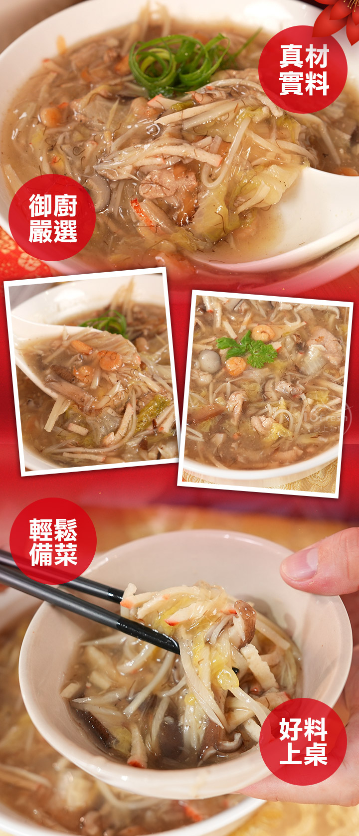 商品成分:水、大白菜、筍絲(麻竹筍、鹽)、豬肉絲(台灣)、紅蟹絲{魚漿[多磷酸鈉、焦糖酸鈉(無水)]、馬鈴薯澱粉、鹽、砂糖、蛋白粉、黏稠劑(磷酸二澱粉)、蟹肉香料(油菜籽油、香料、紅椒色素、普通食用酒精)、紅麴色素、L-麩酸鈉}、偽魚翅(水、明膠、海藻酸鈉、食用黃色四號)、生香菇絲、白蝦仁、蟹管肉、花枝、馬鈴薯澱粉、烏醋[水、釀造米酢、糖、鹽、胡蘿蔔汁、洋蔥汁、番茄汁、柳橙汁、焦糖色素(普通焦糖/著色劑)、香料]、大骨粉{鹽、調味劑 (L-麩酸鈉、胺基乙酸、琥珀酸二鈉、5´-次黃嘌呤核苷磷酸二鈉、5´-鳥嘌呤核苷磷酸二鈉)、麥芽糊精、糖、豬肉粉〔乳糖、醬油粉、植物水解蛋白(大豆、玉米、小麥)、調味劑(DL-胺基丙酸)、芥花油、豬肉抽出物(含豬骨)、葡萄糖、D-木糖〕、洋蔥粉、品質改良劑(二氧化矽)、香料、甘草、薑母、當歸(調味用)、白胡椒}、冰糖、鹽、扁魚、柴魚片(鰹魚、鯖魚)、香油(大豆油、芝麻油)、白胡椒粉[麩皮粉、麥芽糊精、綠辣椒、胡椒(11%)、玉米澱粉、辣椒、茶枝、八角、當歸(調味用)]、髮菜
