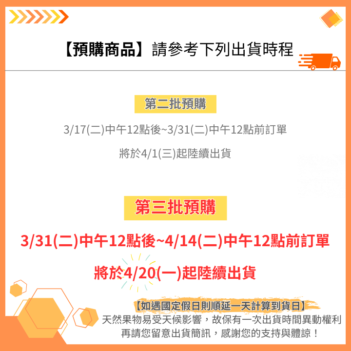 3. 訂單款項須於販售時間內完成付款,若未完成付款之訂單,將安排於下次出貨,造成不便敬請原諒。