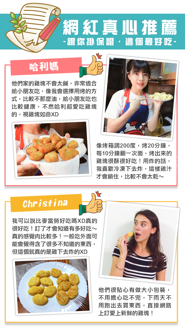 優鮮原味雞塊,含肉率高達80%,比一般速食店還好吃,鮮嫩多汁,大人小孩都愛吃!